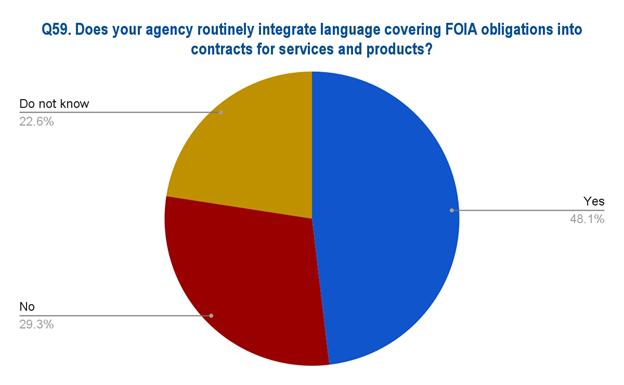 The inclusion or omission of language covering FOIA obligations into contracts for services and products does not affect the statutory obligation for record-keeping. The inclusion of such language serves to set expectations up-front, so contracting companies and contract staff understand how the records they create are subject to FOIA. This clarification may yield better responses to FOIA requests, ensuring contractors are aware of the legal responsibilities with regard to record-keeping and FOIA. The inclusion of Q59 in the 2023 RMSA shows that 48 percent of respondents were aware that their agencies included such language in their contracts.