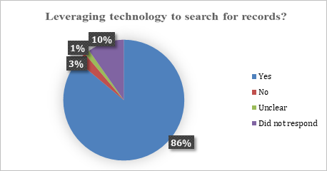 The responses show that agencies are using technology in various ways to search for responsive records, including through e-discovery tools and collaborative platforms that foster document storage and sharing. Sixty-two of 72 agencies responded that they use technology to facilitate efficiency in conducting searches while two agencies responded that they do not.5