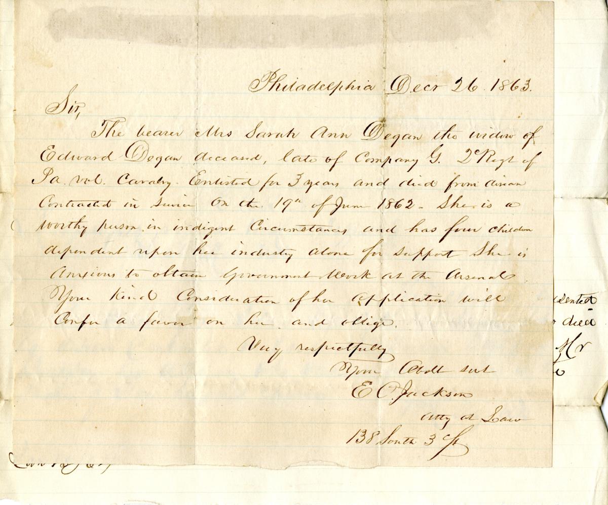This document is a letter written in support of Sarah Ann Deegen’s employment at the Schuylkill Arsenal, Philadelphia, PA, dated December 26, 1863.
