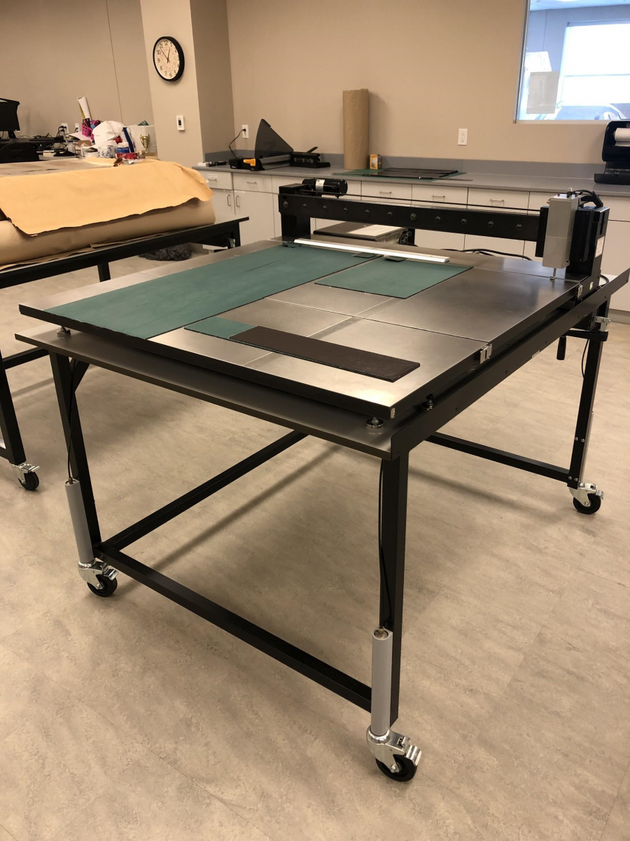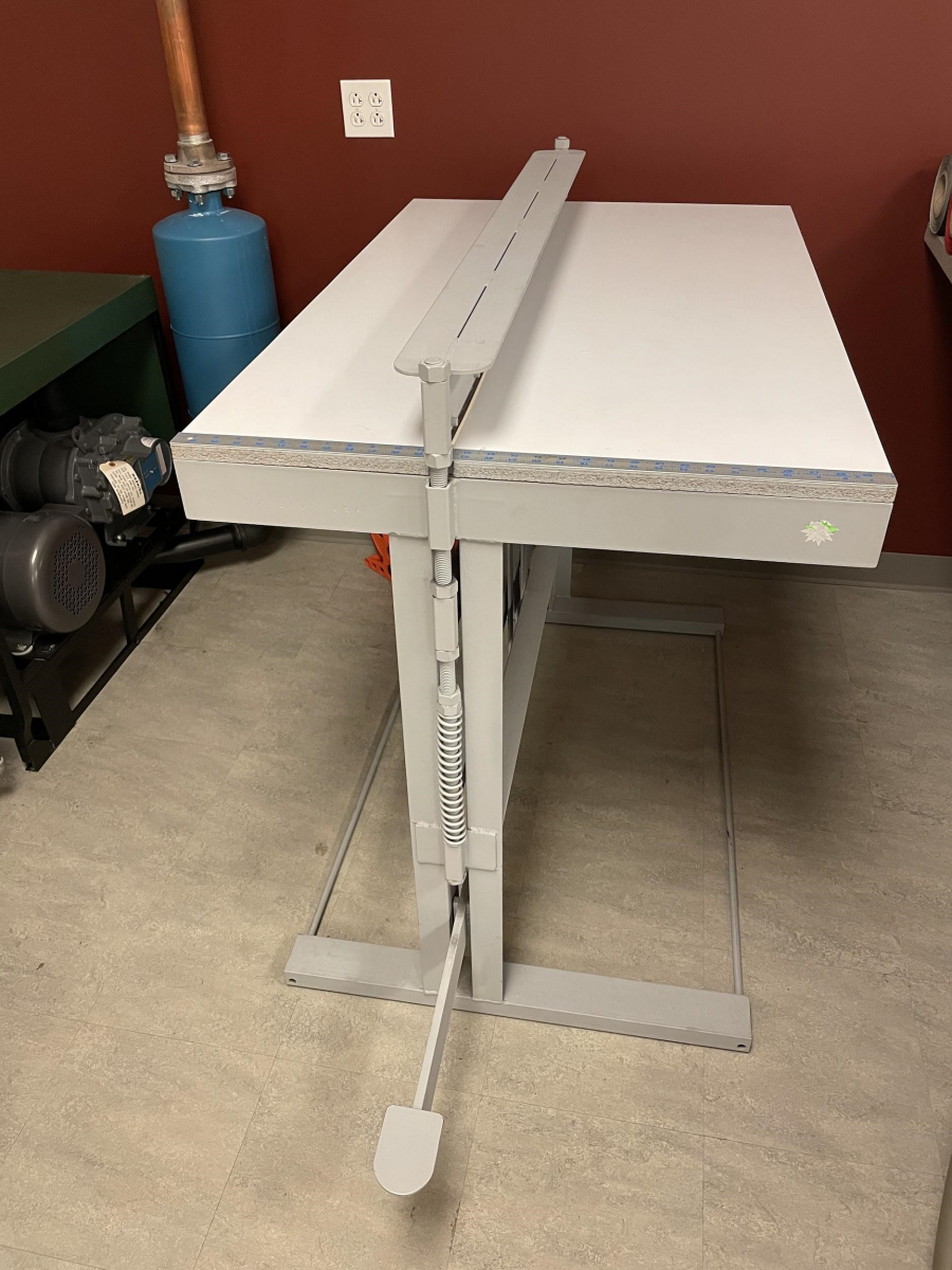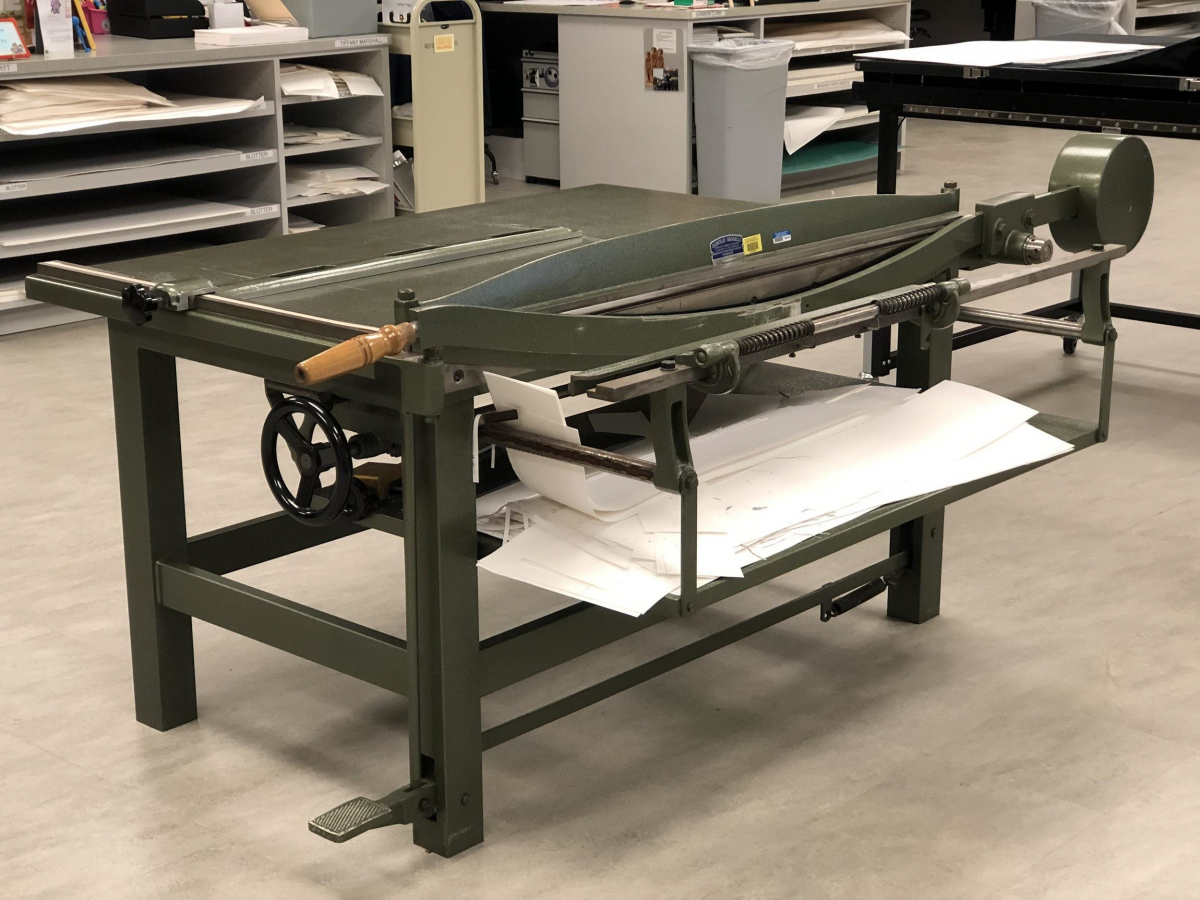 Custom folders and boxes for over-sized records are made using special equipment. Custom folders and boxes are made using the board shear and board creaser, while custom polyester sleeves are made on our ultrasonic welder. Additional bookbinding equipment, including a sewing frame, are also available for special treatment work in the Dry Lab.