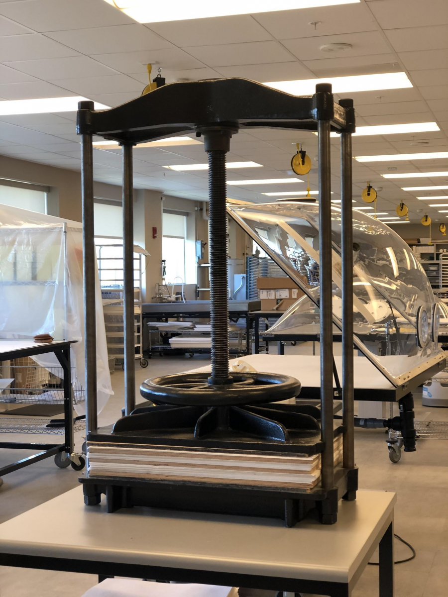 Humidification is used to relax paper fibers and prepare them for flattening. To humidify, the paper fibers are exposed to moist air carefully controlled so the paper does not become saturated or wet. The Paper Lab primarily employs humidification domes for this treatment, although other methods are used depending upon condition and type of paper. After humidification, each sheet is carefully placed between blotter paper and dried under pressure in a book press or under weights.
