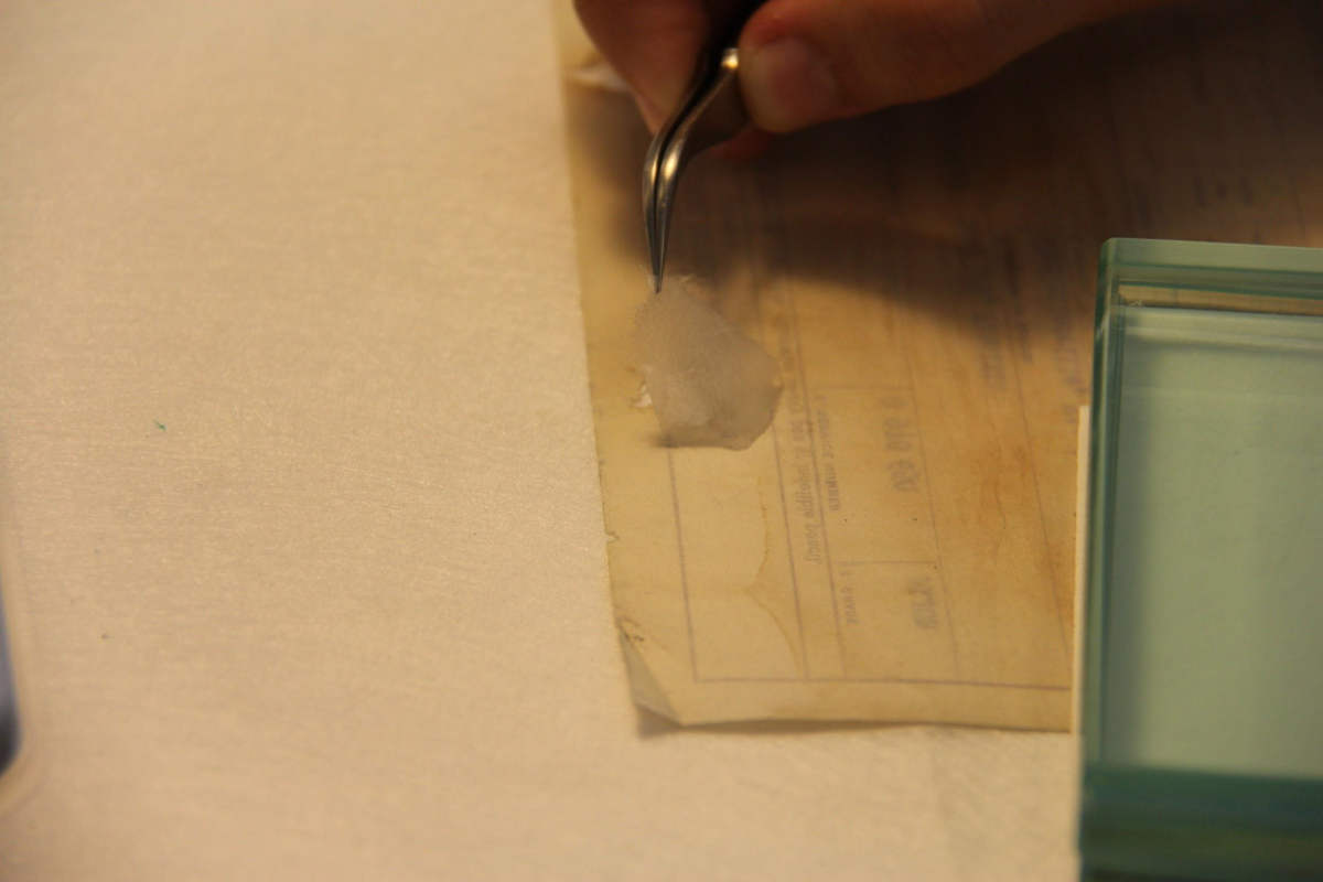 Mending is performed using a conservation-quality Japanese tissue paper so thin it is almost transparent. The long fibers of this paper make for a strong repair. The adhesives used are made by the Lab and must be reversible and stable. The Paper Lab also prepares papers coated with adhesives activated by either heat or moisture. A light table is often used to better view the tear and ensure the best alignment of the edges when applying the mend. Once adhered, a soft non-woven polyester isolating layer, an absorbent blotter and a light weight are placed over the mend so it dries under pressure.