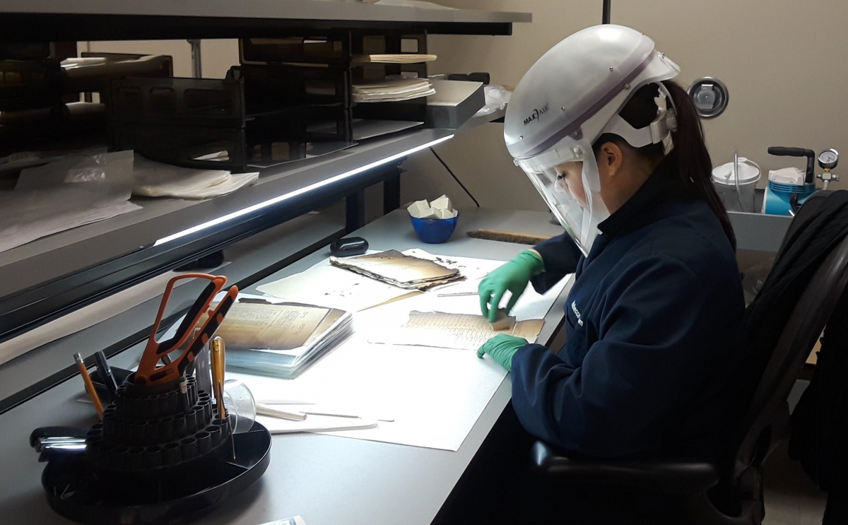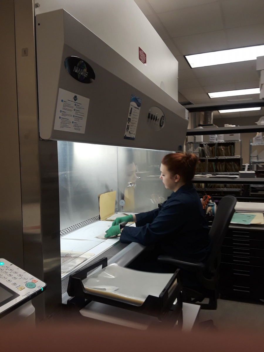 The Decontamination Lab is the necessary first stop for damaged records that pose a health hazard. The room is kept under negative pressure to help contain bio-contaminants, such as mold or soot. The treatment work can be performed inside a biosafety cabinet, which protects staff by venting contaminants away from the worker. Staff also use individual respirators at work stations to treat paper that is too fragile to withstand the ventilation within a biosafety cabinet. Before cleaning begins, any fasteners such as staples and paper clips must be carefully removed. Surface cleaning using High Efficiency Particulate Air (HEPA) vacuums, vinyl sponges, and soft brushes removes much, although not all, of the mold and soot. Some mold and dirt may remain embedded in the paper fibers where it cannot be removed without further damaging the paper. Once mold and soot abatement is complete, the record moves from the Decontamination Lab to the Wet Lab for further treatment if pages are distorted, torn, or fragmented.