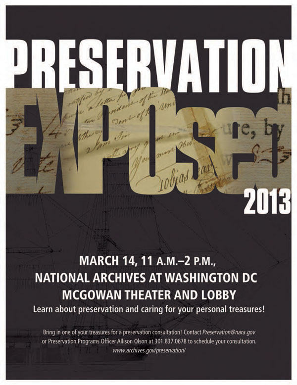 National Archives Preservation Programs is hosting Preservation EXPOsed! on March 14 th from 11:00 a.m. to 2:00 p.m. in the McGowan Theater and Lobby at the National Archives in Washington, DC.