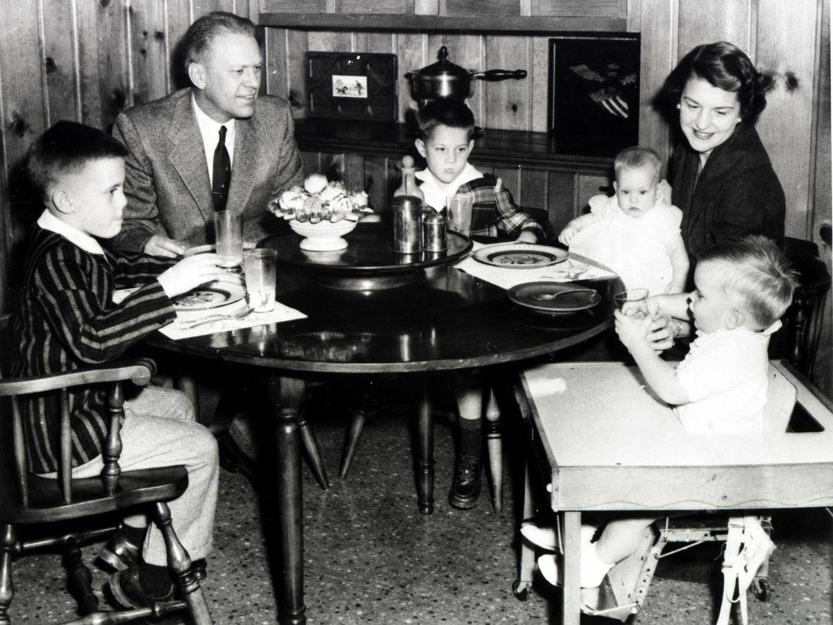 Congressman Gerald Ford, wife Betty and their children Mike, Jack, Susan, and Steve sit in the dining room of their home at 514 Crown View Drive, Alexandria, Virginia. 1958. Gerald R. Ford Presidential Library and Museum Identifier H0042-03, National Archives Identifier 187004