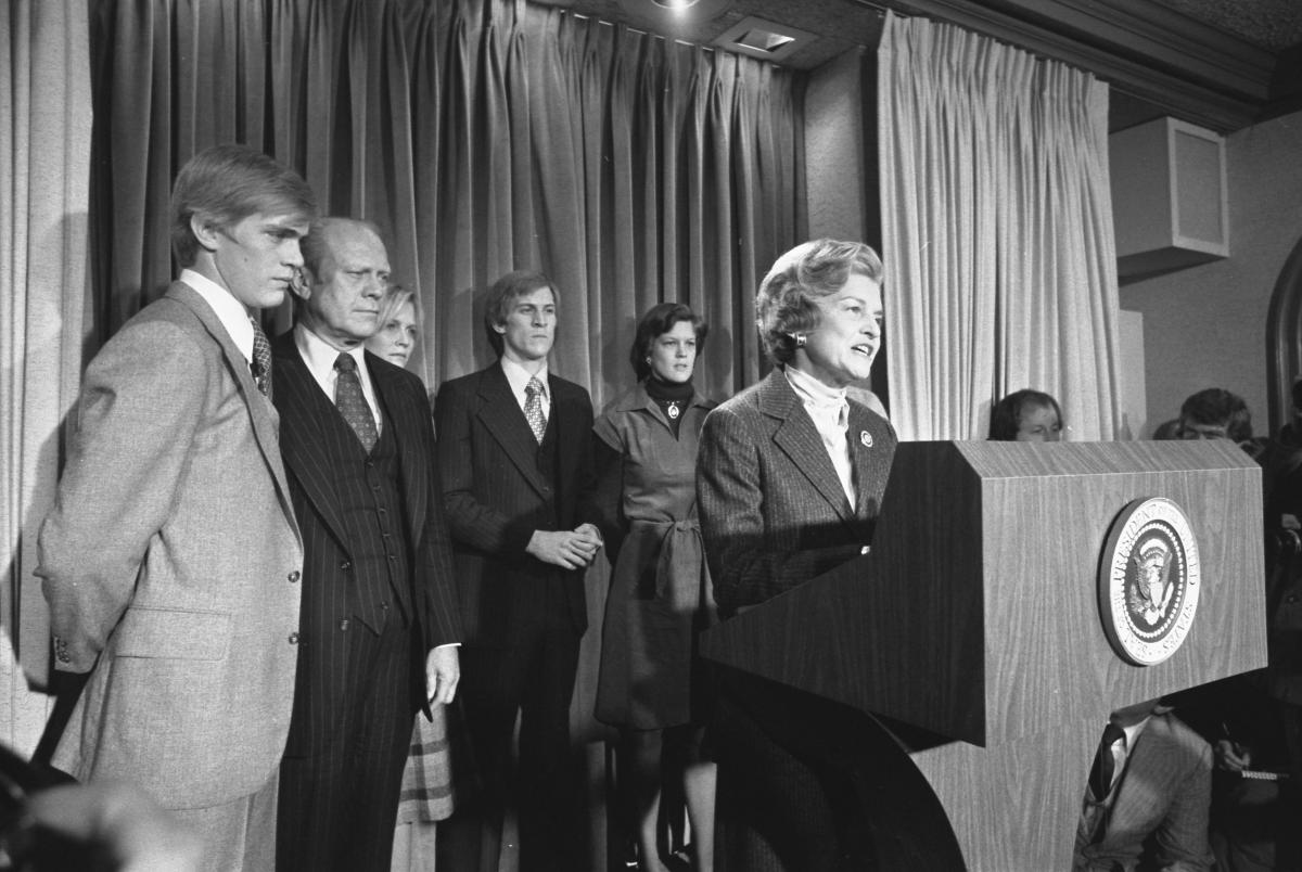First Lady Betty Ford reads President Gerald R. Ford’s concession statement to the media following Jimmy Carter’s victory in the 1976 election. November 3, 1976. Gerald R. Ford Presidential Library and Museum Identifier B2193-08A, National Archives Identifier 5730760