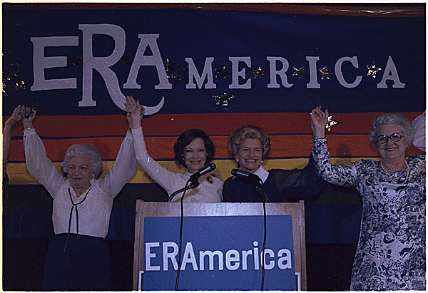 Rosalynn Carter and Betty Ford at a rally for the Equal Rights Amendment (ERA). November 19, 1977. Jimmy Carter Presidential Library and Museum, National Archives Identifier 176940