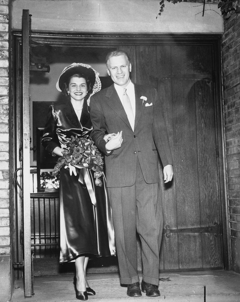 Gerald and Betty Ford walk out of Grace Episcopal Church in Grand Rapids, Michigan, following their wedding. October 15, 1948. Gerald R. Ford Presidential Library and Museum Identifier H0013-01, National Archives Identifier 186888