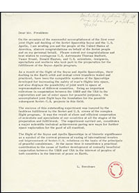 (Left) Leonid Brezhnev's letter of July 25, 1975 noted that “the flight of the Soyuz and Apollo Spaceships” was a “symbol of the current process of easing of international tension and improvement of Soviet-U. S. relations on the basis of . . . . peaceful coexistence.”