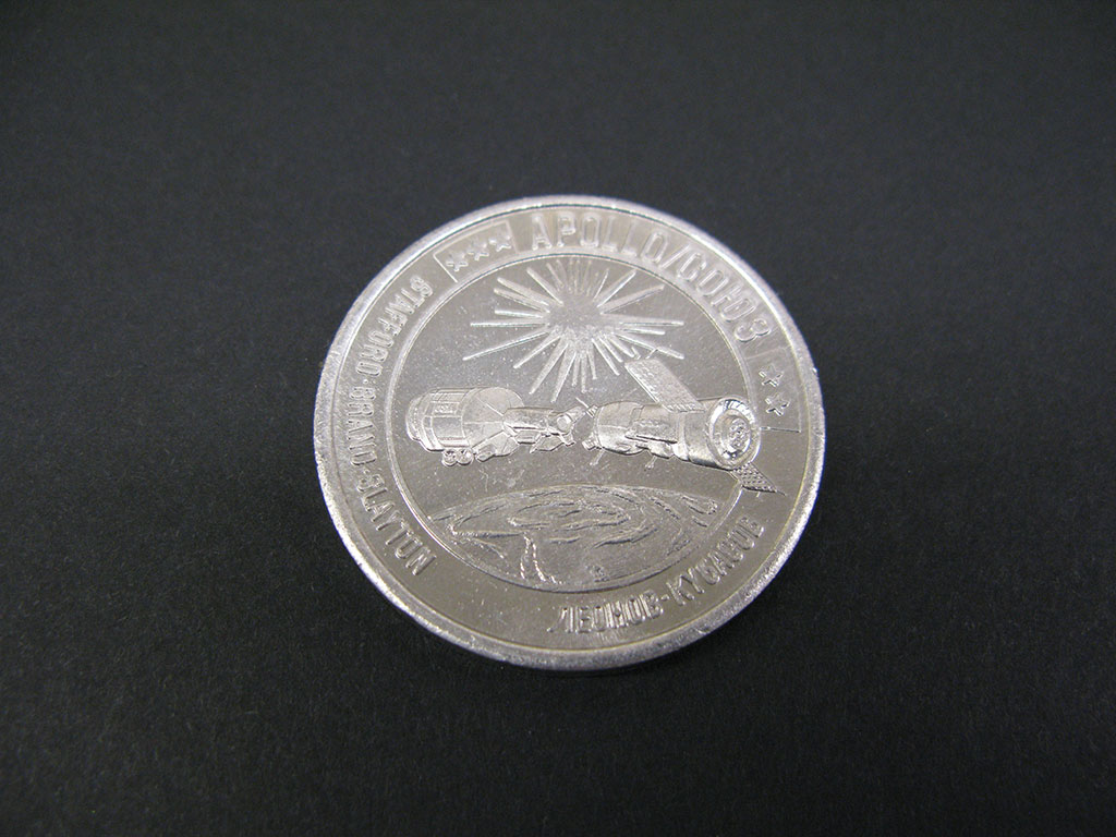 This commemorative medal depicts the two spaceships meeting in space. The medal is made with metal that was taken from both the Apollo and Soyuz spacecrafts after they returned to earth.