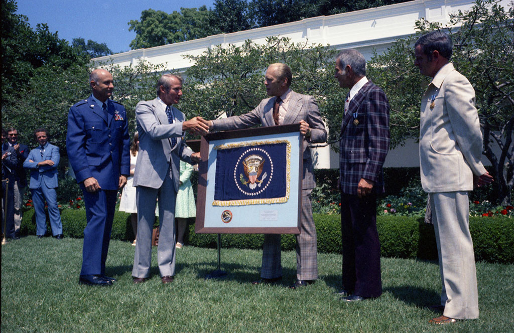 On August 9, 1975, the Apollo astronauts Thomas Stafford, Donald Slayton, Vance Brand and Technical Director Glynn Lunney presented Ford with the Presidential flag taken with them on the mission after receiving the NASA Distinguished Service Medal.