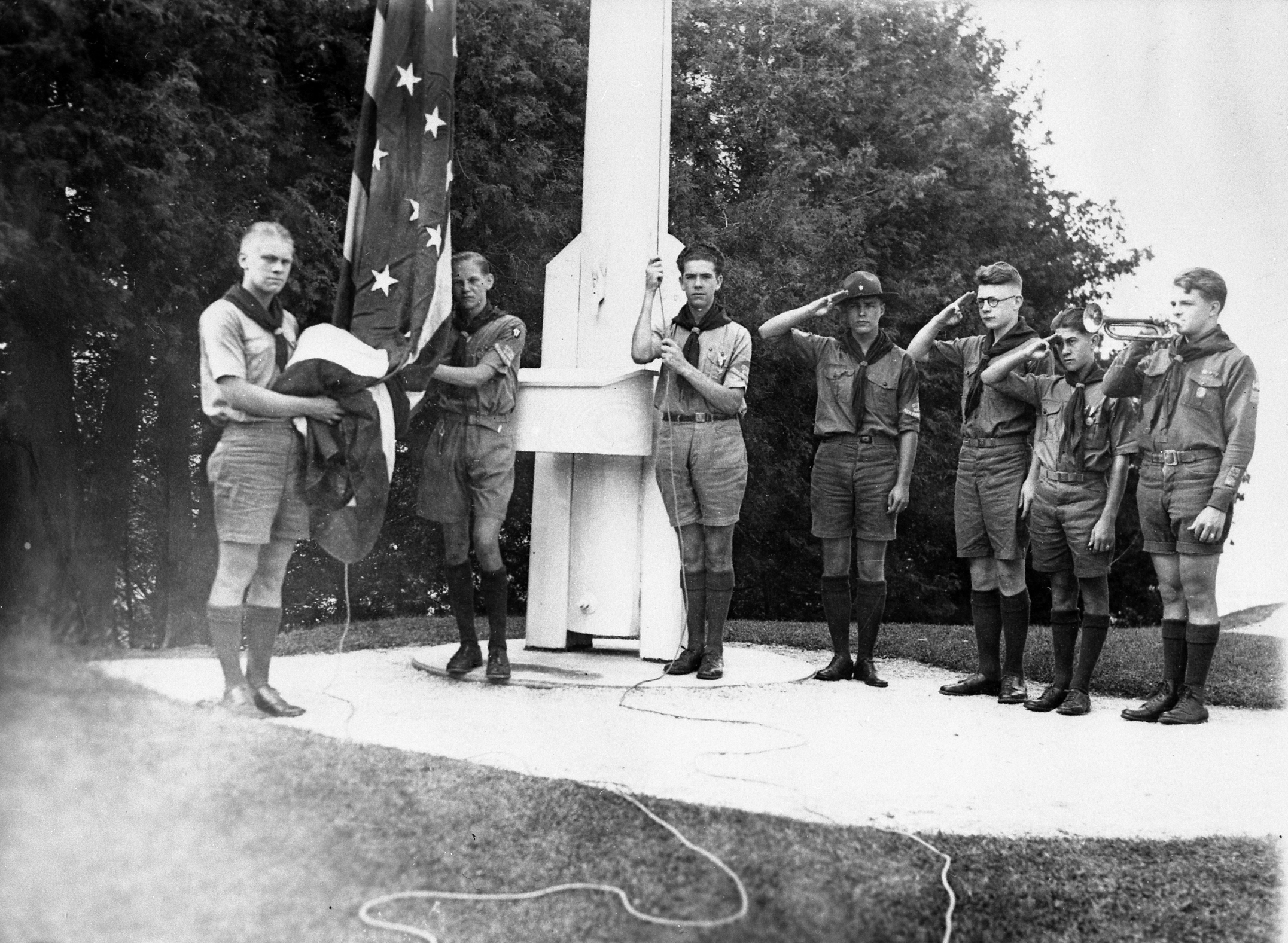 Gerald R. Ford, Jr. holds the flag as he and his fellow members of the Eagle Scout Guard of Honor prepare to raise the colors over Fort Mackinac at Mackinac Island State Park, MI. The troop served as guides during the summer months.