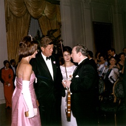 President John F. Kennedy and First Lady Jacqueline Kennedy visit with violinist Isaac Stern, following his performance at a dinner in honor of Minister of State for Cultural Affairs of France, André Malraux. In foreground (L-R): Mrs. Kennedy; President Kennedy; wife of the minister, pianist Madeleine Malraux; Mr. Stern. East Room, White House, Washington, D.C.