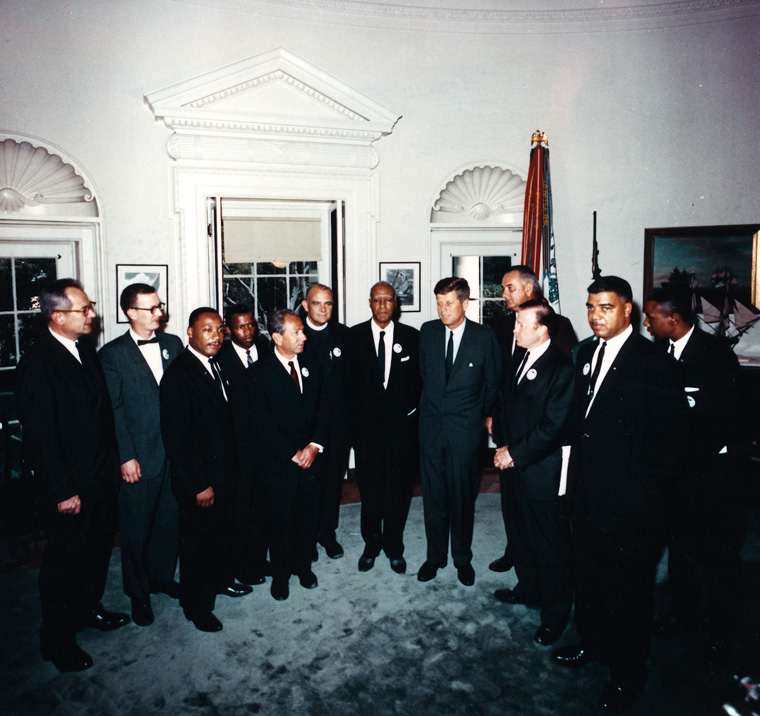 President Kennedy meets with the leaders of the March On Washington. L-R: Secretary of Labor Willard Wirtz, Mathew Ahmann, Rev. Dr. Martin Luther King, Jr., John Lewis, Rabbi Joachim Prinz, Rev. Eugene Carson Blake, A. Philip Randolph, President Kennedy, Vice President Johnson, Walter Ruether, Whitney Young, Floyd McKissick. White House, Oval Office.