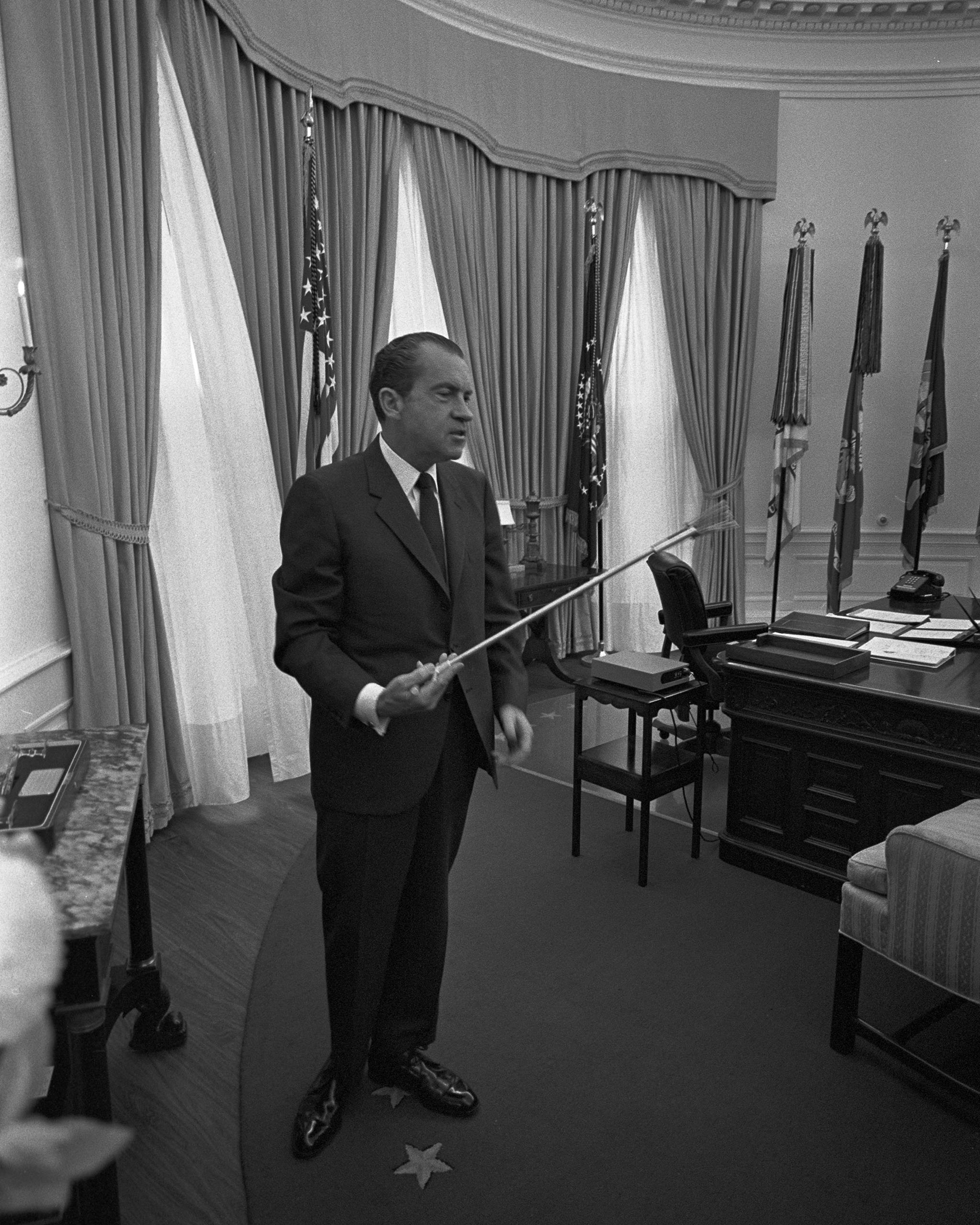 President Nixon standing in the Oval Office holding the set of tongs used by astronauts during Moon surface explorations, January 27, 1970.