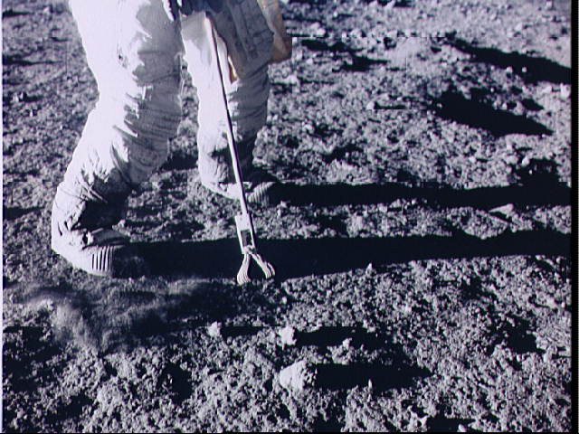 Close-up view of a set of tongs, an Apollo Lunar Hand Tool, being used by Astronaut Charles Conrad Jr., to pick up lunar samples during the Apollo XII mission, November 19, 1969.