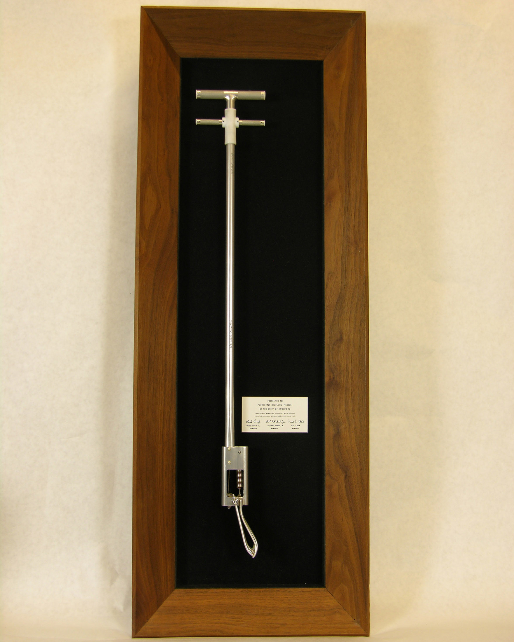 This set of tongs was used to collect lunar samples from the “Ocean of Storms,” the largest dark spot on the Moon's surface, during the Apollo XII mission. It was presented to President Nixon by astronauts Charles Conrad, Jr., Richard Gordon, Jr., and Alan Bean.