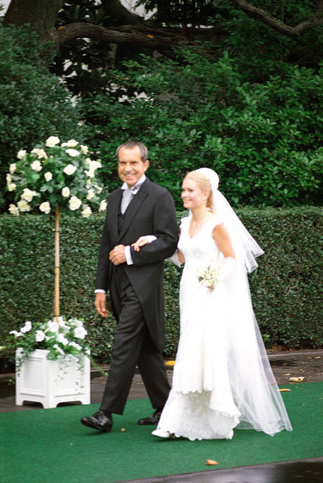 With rains threatening to postpone what would be one of the first Rose Garden weddings at the White House, a break in the weather allowed sufficient time for President Richard Nixon’s eldest daughter Tricia to marry Edward Finch Cox. This photograph shows President Nixon as he escorts his daughter down the aisle, June 12, 1971.