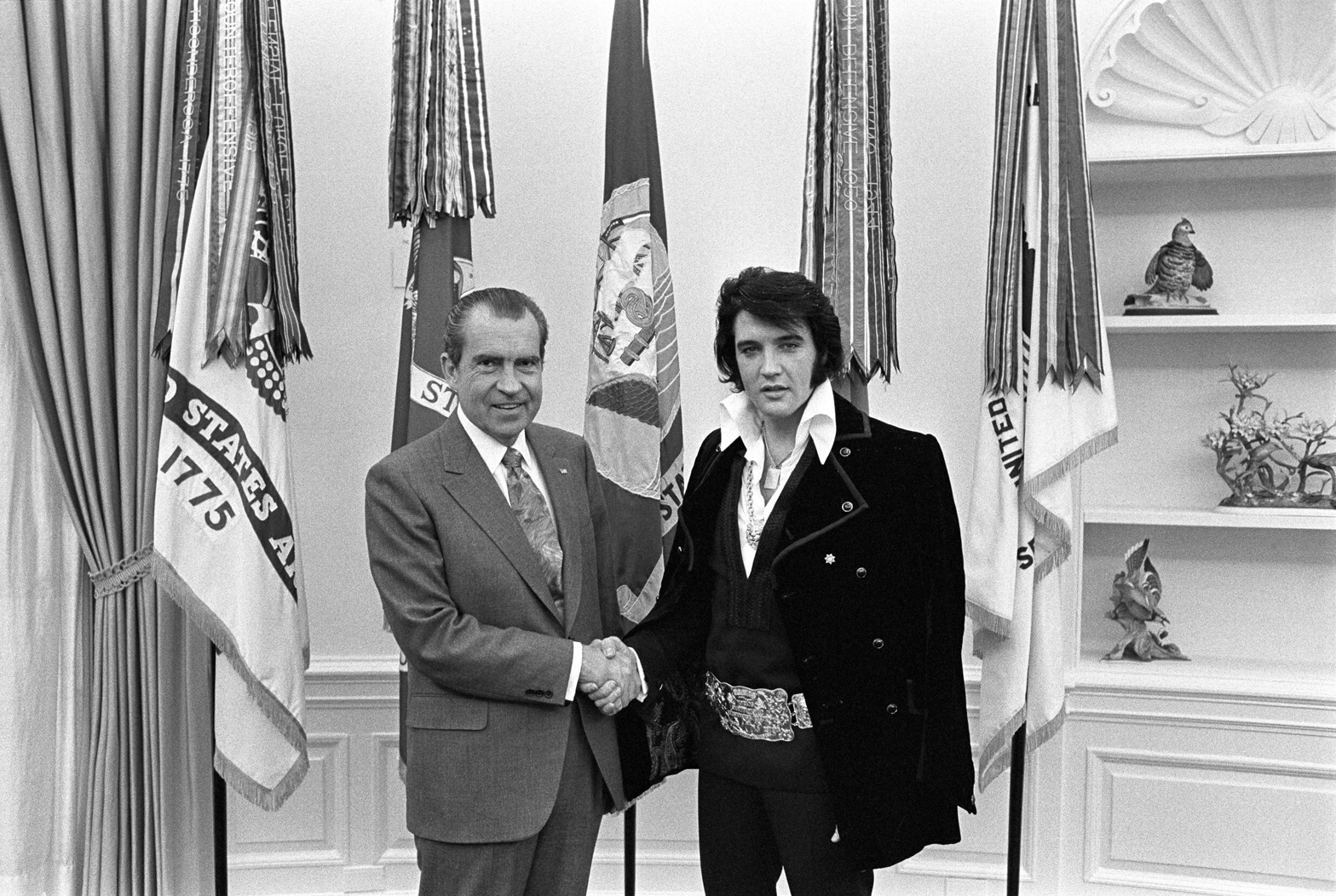 Rock-and-roll star Elvis Presley requested a meeting with President Nixon on December 21, 1970 to discuss his interest in becoming personally involved with the fight against drugs – this encounter became an iconic moment in American history. They are shown here in the Oval Office of the White house shaking hands.