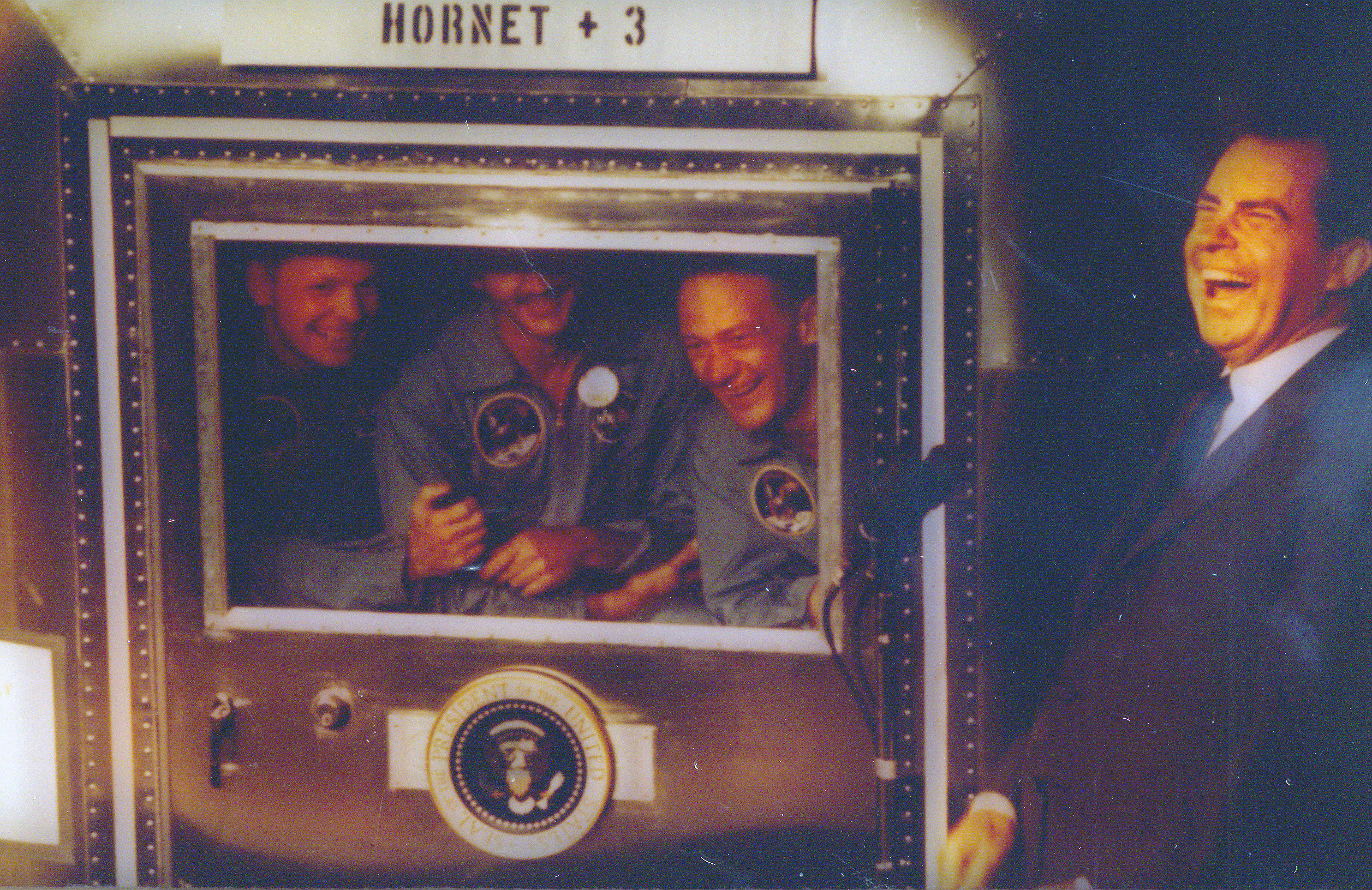 President Nixon greets the Apollo 11 astronauts who are inside the Mobile Quarantine Facility or MQF aboard the USS Hornet, the prime recovery vessel, July 24, 1969. Pictured from left to right are Commander Neil Armstrong, Command Module Pilot Michael Collins and Lunar Module Pilot Edwin "Buzz" Aldrin and President Nixon.