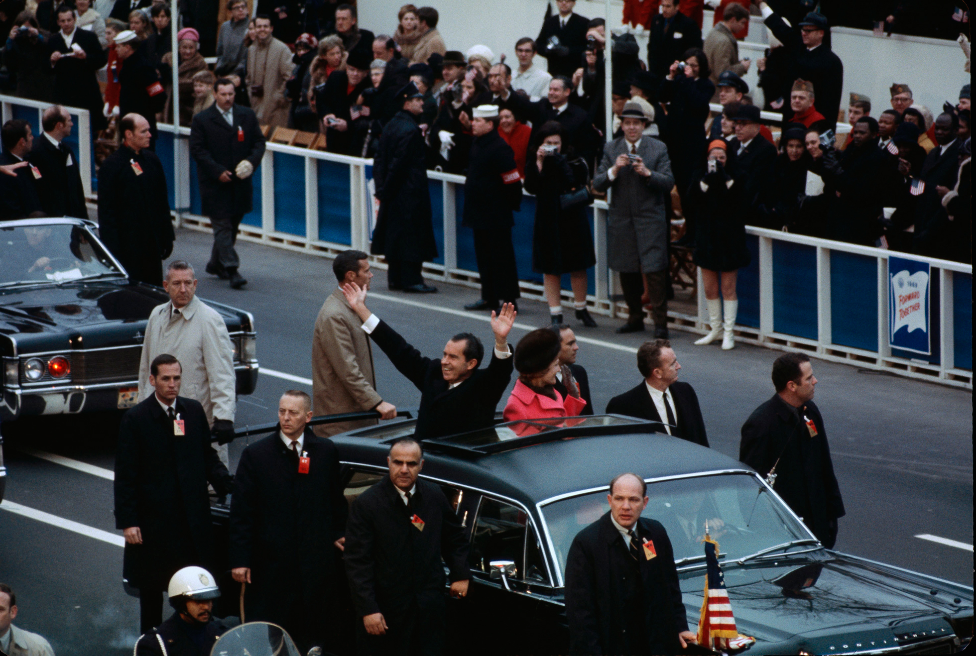 Surrounded by Secret Service personnel, newly inaugurated President Richard Nixon and Mrs. Nixon wave at the crowds from the Lincoln Continental limousine making its way down Pennsylvania Avenue to the White House, January 20, 1969.