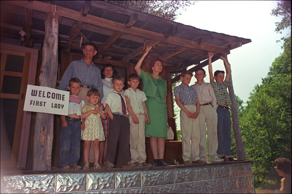 Lady Bird Johnson stands on the porch of Mr. and Mrs. Arthur Robertson with their children in the Cumberland Plateau in rural Kentucky, May 21, 1964.