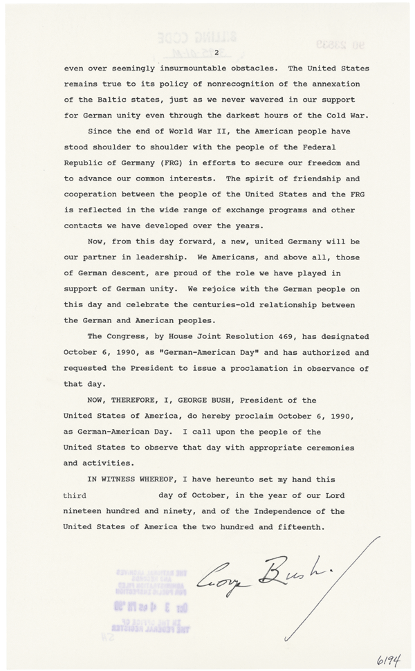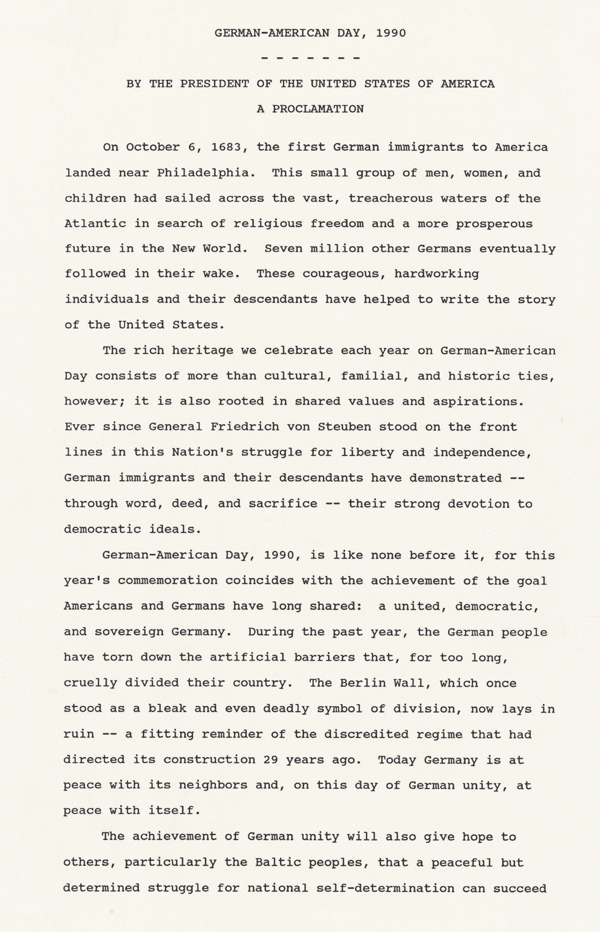 President George H.W. Bush commemorates German-American Day and German Reunification, October 3, 1990
