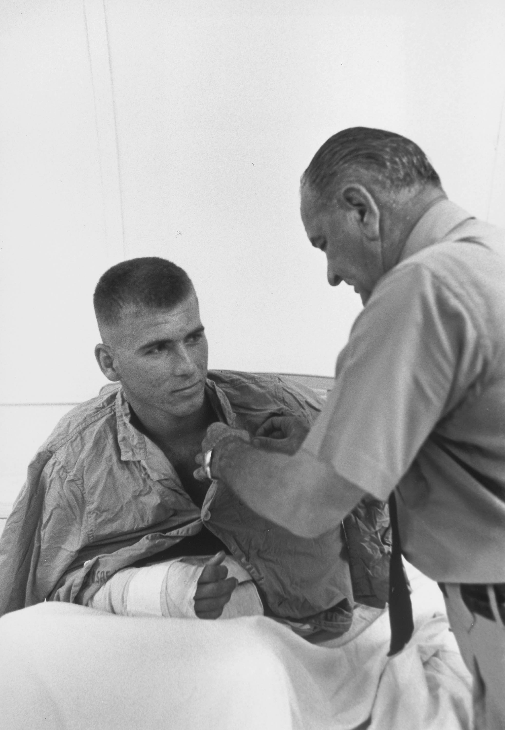 President Lyndon Johnson awards a medal to a wounded U.S. serviceman in Cam Rahn Bay, South Vietnam, October 26, 1966.