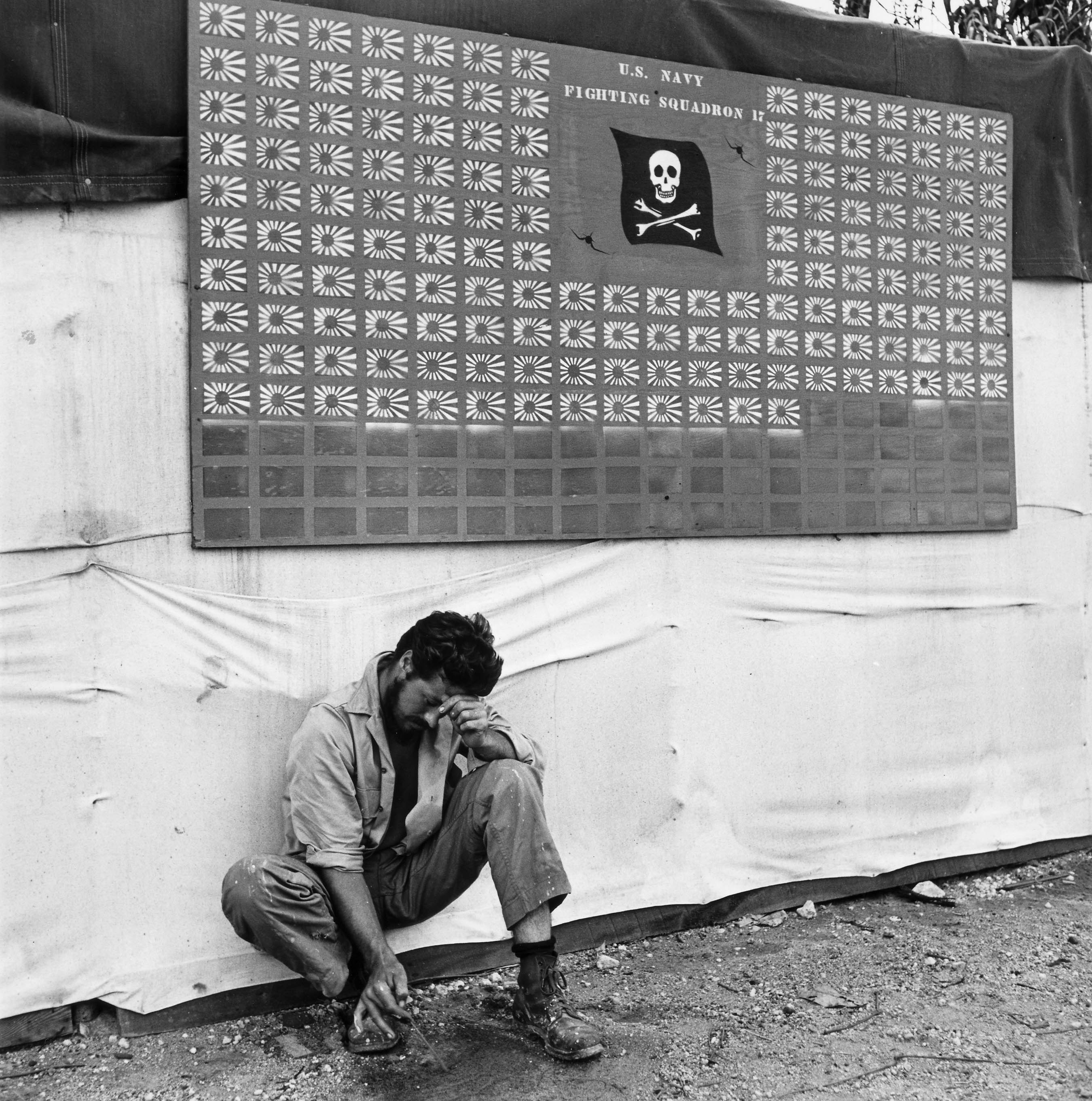 "Tired member of VF-17 pauses under the squadron scoreboard at Bouganville" February 1944.