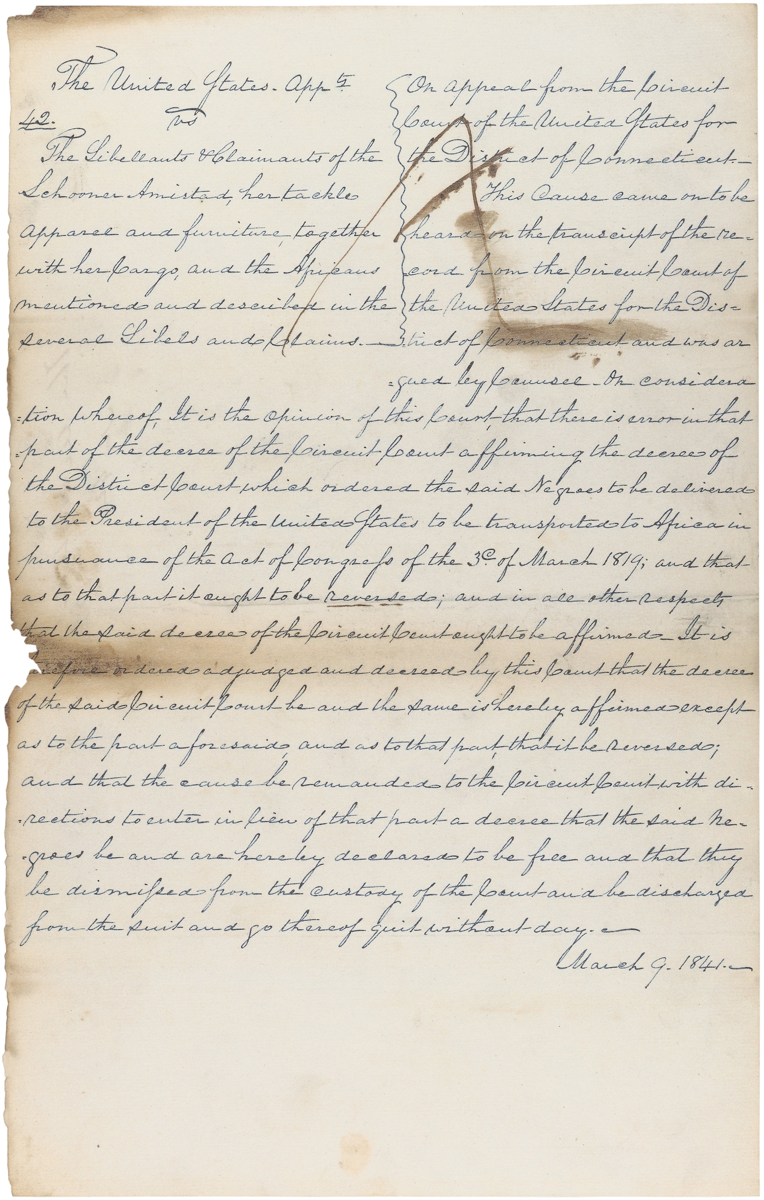 Opinion of the Supreme Court in United States v. The Amistad, March 9, 1841. Senior Justice Joseph Story wrote and read the decision of the Court. The Supreme Court ruled that the Africans on board the Amistad were free individuals. Kidnapped and transported illegally, they had never been slaves. The decision affirmed that ". . . it was the ultimate right of all human beings in extreme cases to resist oppression, and to apply force against ruinous injustice." The Court ordered the immediate release of the Amistad Africans. The first court proceedings in the Amistad case took place in Hartford's Old State House. National Archives and Records Administration, Records of the Supreme Court of the United States.