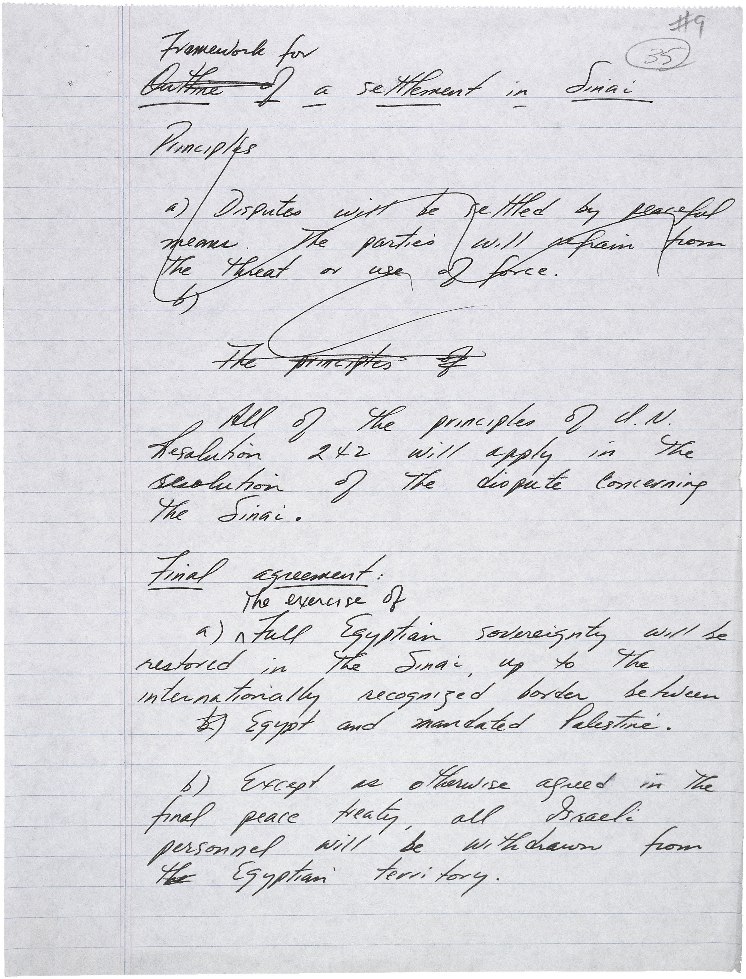 President Jimmy Carter's draft, "Framework for a settlement in the Sinai," 1978, page 1. The issue of Israeli withdrawal from the Sinai emerged as the greatest obstacle to a peace agreement between the two countries. Throughout the negotiations, President Carter clung fiercely to the goal of an agreement, even as both sides threatened to leave. He served, not only as mediator, but also as draftsman, immersing himself in the minutest details of the proposed agreements to produce compromise proposals. This is one of several working drafts that President Carter personally produced over the course of the negotiations. National Archives and Records Administration, Jimmy Carter Library, Atlanta, Georgia.