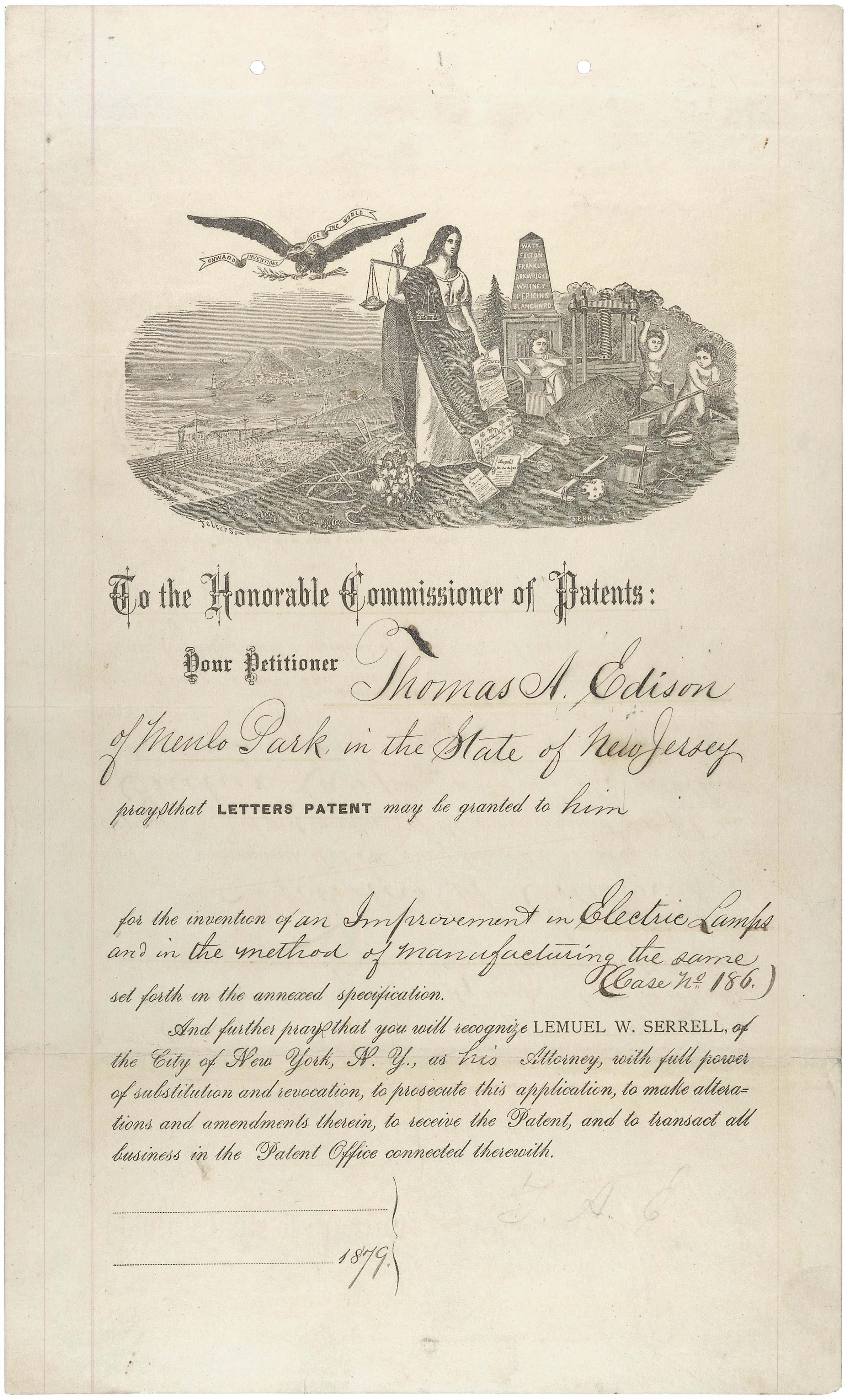 Thomas Edison's patent application for an "Improvement in Electric Lamps," November 1, 1879. Thomas Edison propelled the United States out of the gaslight era and into the electric age. In 1878, the creation of a practical long-burning electric light had eluded scientists for decades. With dreams of lighting up entire cities, Edison lined up financial backing, assembled a group of brilliant scientists and technicians, and applied his genius to the challenge of creating an effective and affordable electric lamp. On January 27, 1880, Edison received the historic patent embodying the principles of his incandescent lamp that paved the way for the universal domestic use of electric light. National Archives and Records Administration, Records of the Patent and Trademark Office. Due to conservation restrictions, some venues will display the first page of the original document and a facsimile of the second page, while the other venues will display a facsimile of the first page and the original second page.
