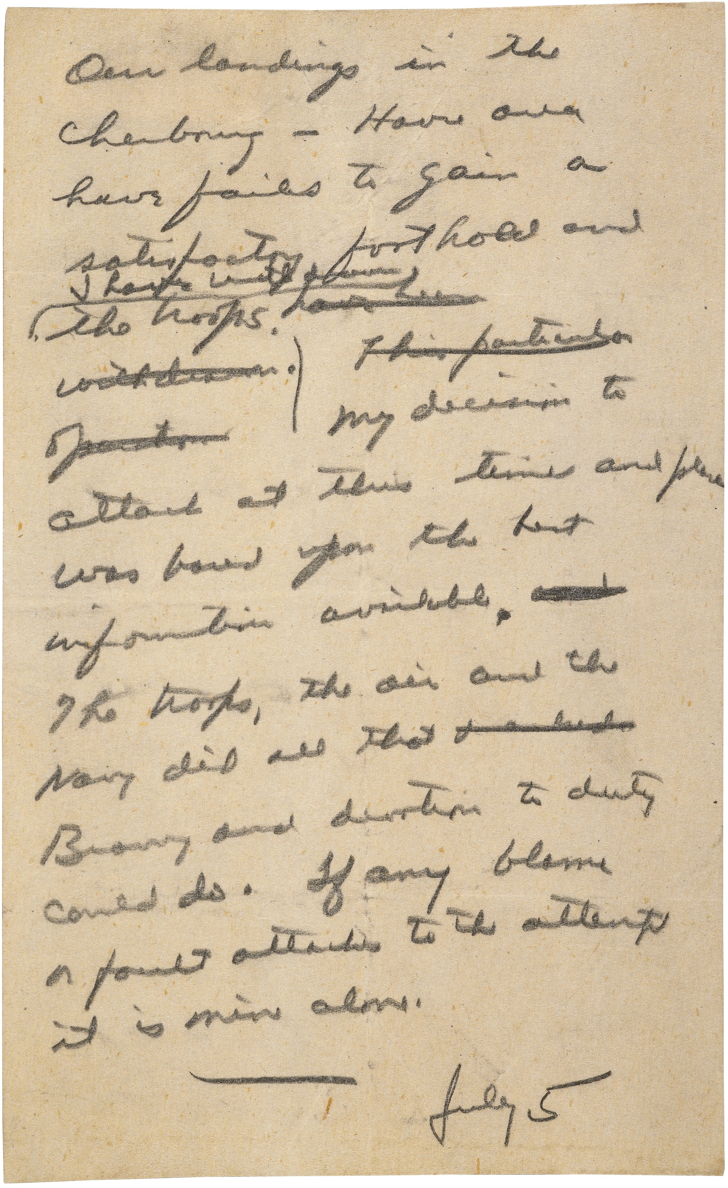 A note, in case of failure, written by Gen. Dwight D. Eisenhower on June 5, 1944, but misdated July 5. Heavy rains, high winds and rough seas complicated the decision on the exact timing of the D-day invasion. In the early morning hours of June 5, 1944, with meteorologists predicting a temporary break in the weather, Eisenhower gave the final order that put the vast operation in motion. Hours later, he wrote this note and slipped it into his wallet. It was a statement that he would issue in case the operation were to fail. The only apparent hint of nerves on his part is his error in dating the note "July 5," instead of June 5. Weeks after his troops had breached the Nazis' "Atlantic Wall," Eisenhower tossed this note in the wastebasket. It was retrieved by his naval aide, Captain Harry Butcher, and is now among the holdings of the Dwight D. Eisenhower Library in nearby Abilene, KS. National Archives and Records Administration, Dwight D. Eisenhower Library, Abilene, Kansas.