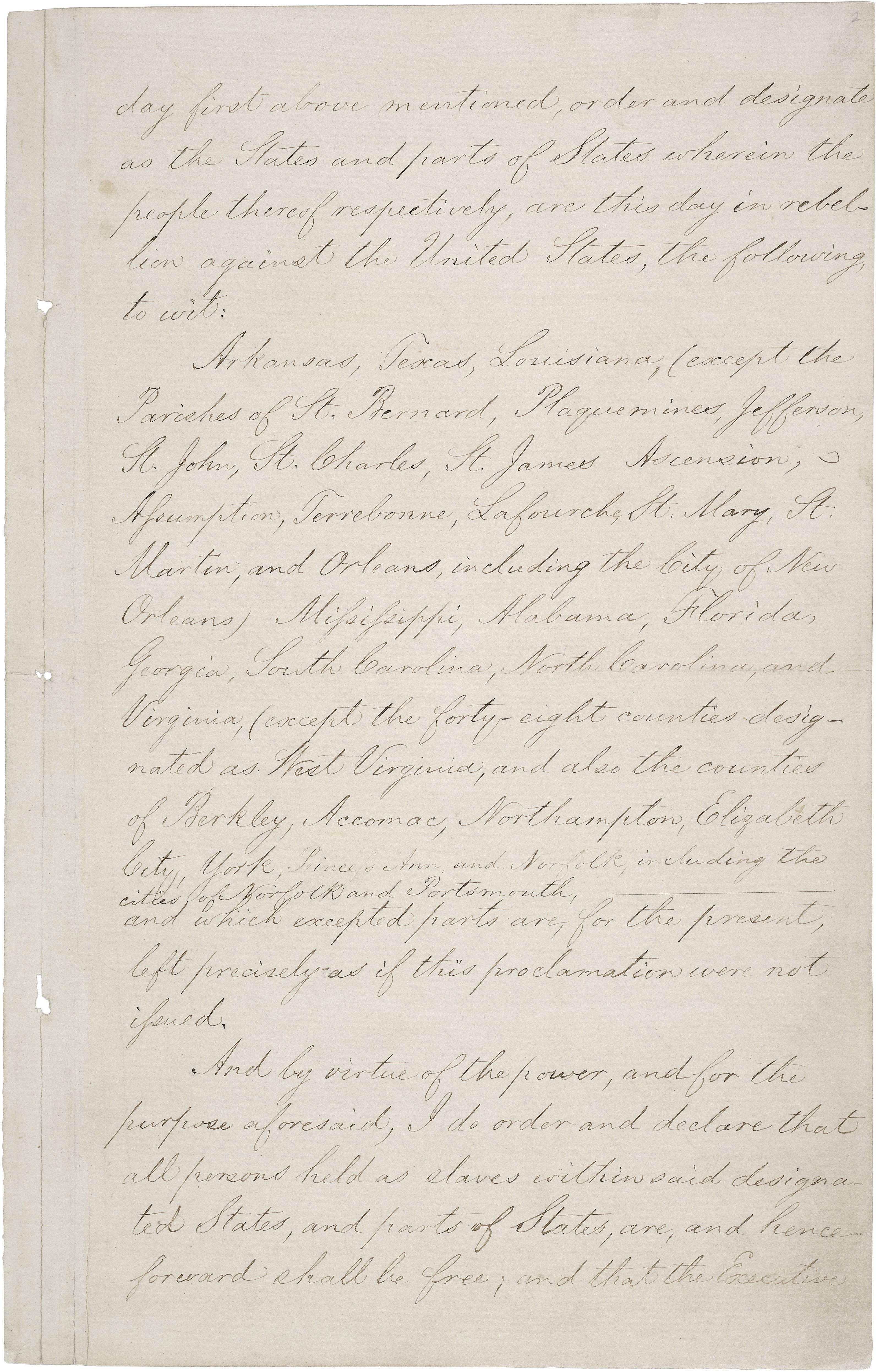 Page Two, Page Three, Page Four, Page Five. Emancipation Proclamation, signed by President Lincoln, 1863. National Archives and Records Administration, General Records of the U.S. Government. That proclamation declared "that all persons held as slaves" within the rebellious states "are, and henceforward shall be free." Due to the fragility of this document, it may be exhibited for no longer than four days in each city.