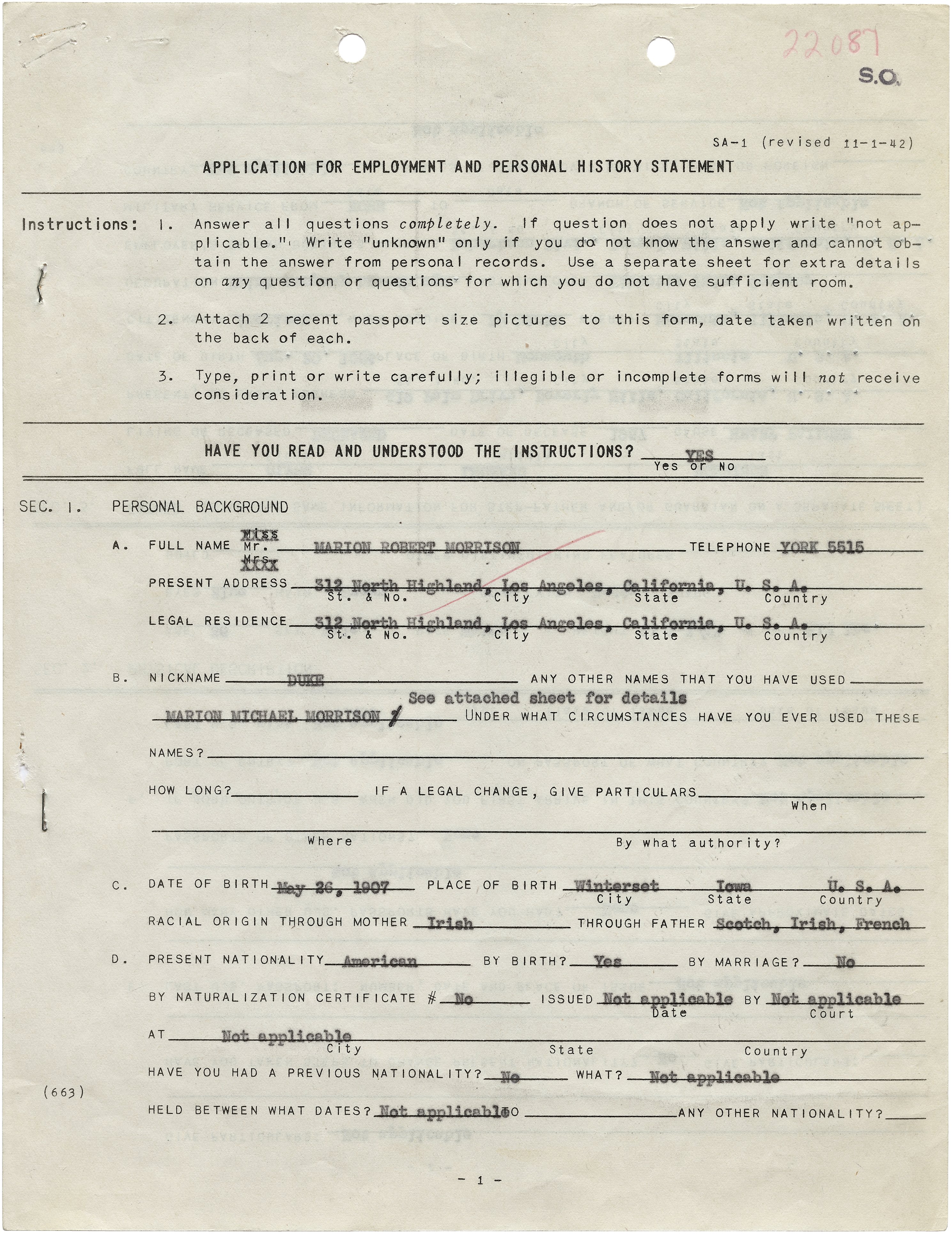 John Wayne's application for employment with the Office of Strategic Services (OSS), forerunner of the Central Intelligence Agency (CIA), August 2, 1943. Wayne applied for, but did not receive, a commission with the OSS during World War II. National Archives and Records Administration, Records of the Office of Strategic Services.