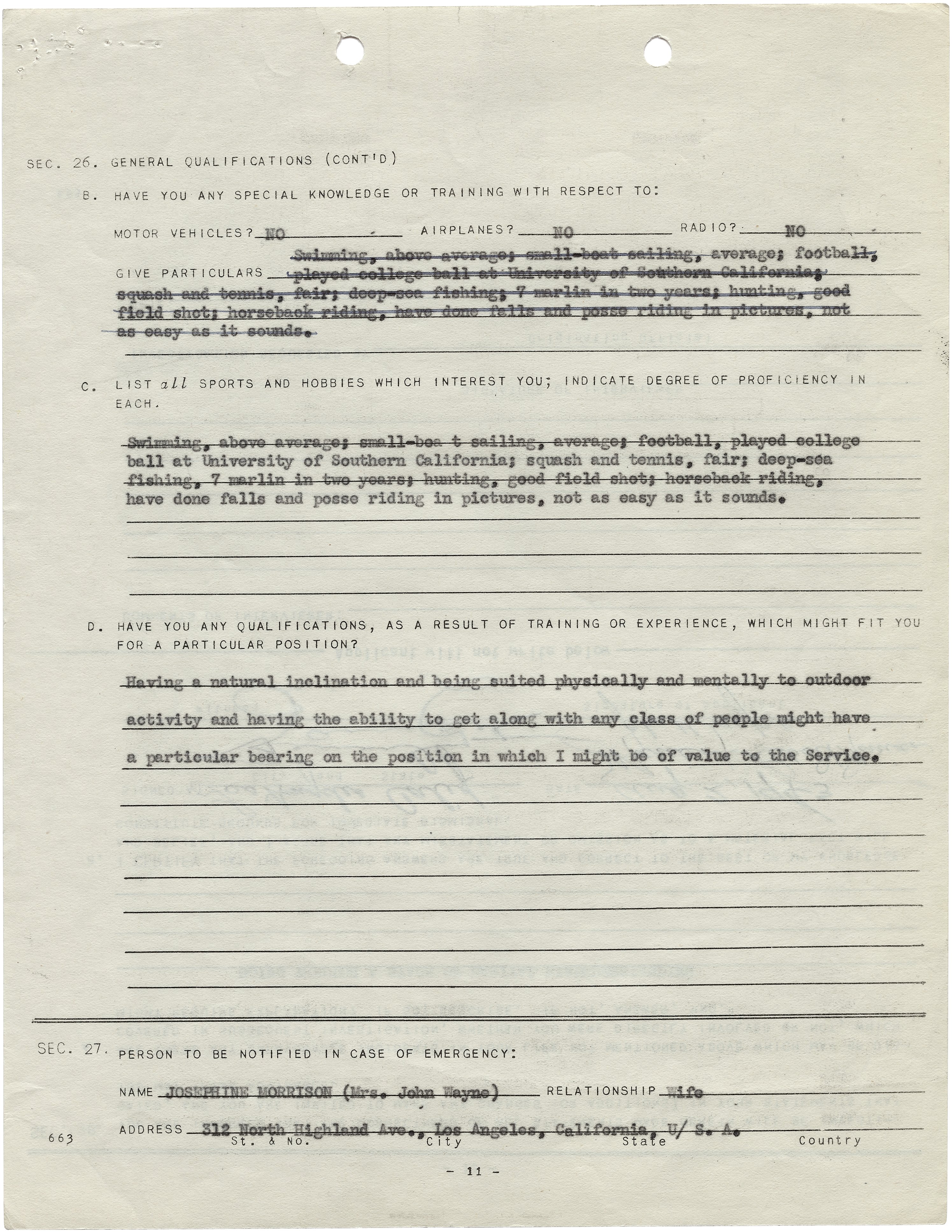 John Wayne's application for employment with the Office of Strategic Services (Page Twelve)