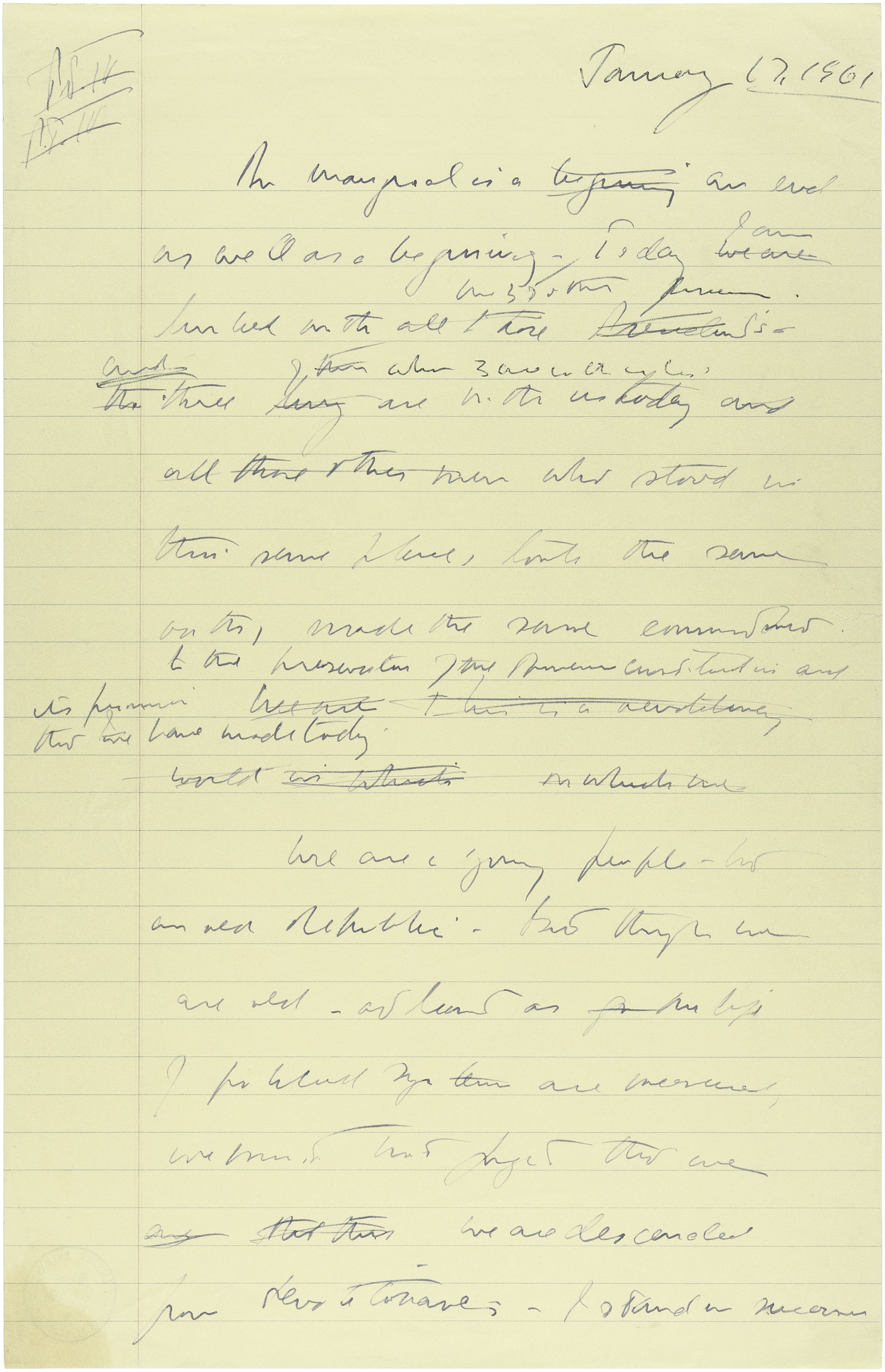 John F. Kennedy's handwritten draft of his inaugural address, January 17, 1961, first page