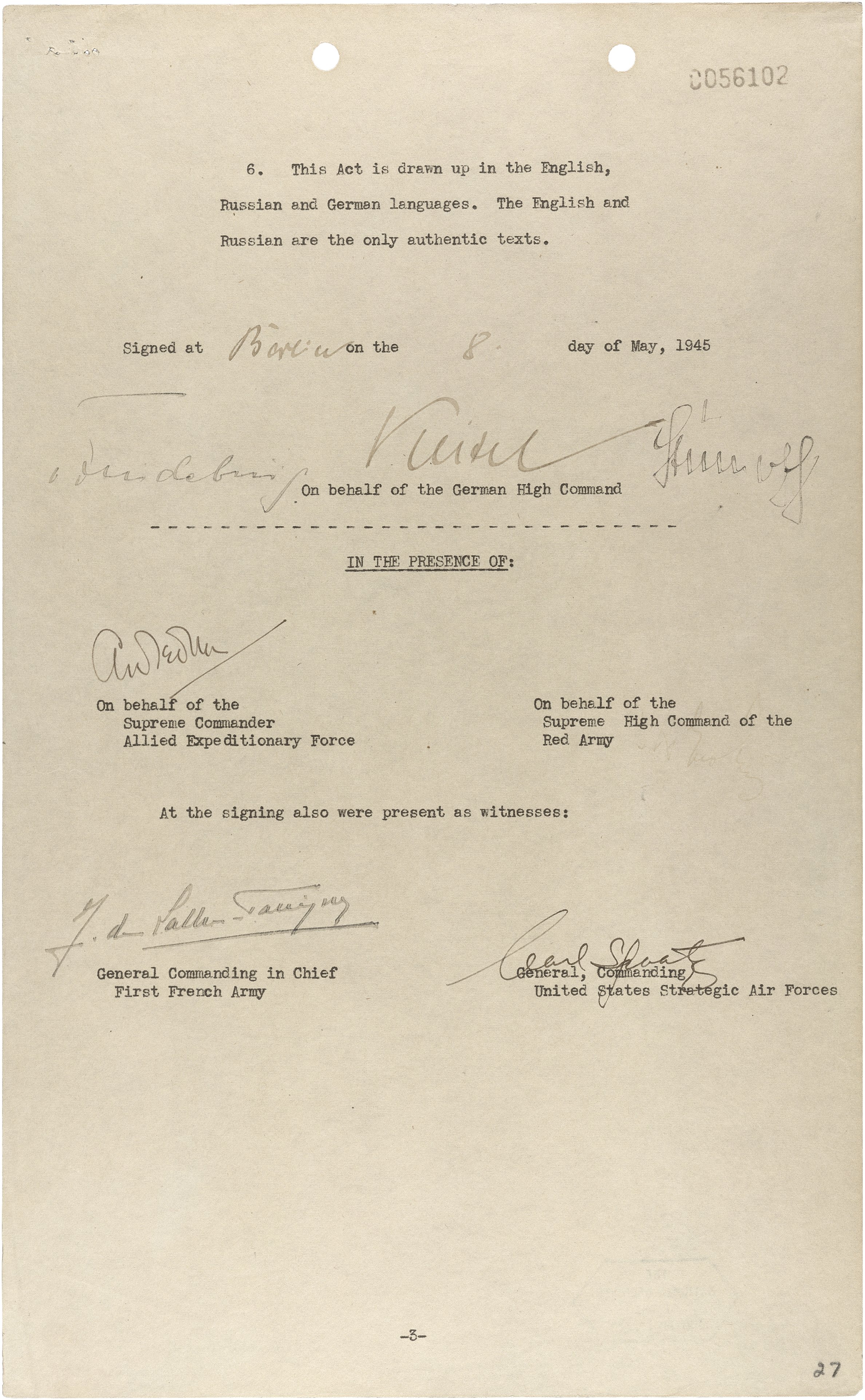 Page Two, Page Three. German Military Surrender, signed at Berlin, May 8, 1945. This document was a purely military surrender, aimed at ending the fighting and halting any further bloodshed. Article 4 provided for a more general political surrender that would come later. National Archives and Records Administration, Records of the U.S. Joint Chiefs of Staff. Due to conservation restrictions, this document will be displayed in New York, Columbus, and Atlanta. The Act of Military Surrender, signed at Rheims on May 7, 1945, will be on display in Kansas City, San Antonio, Los Angeles, and Hartford.