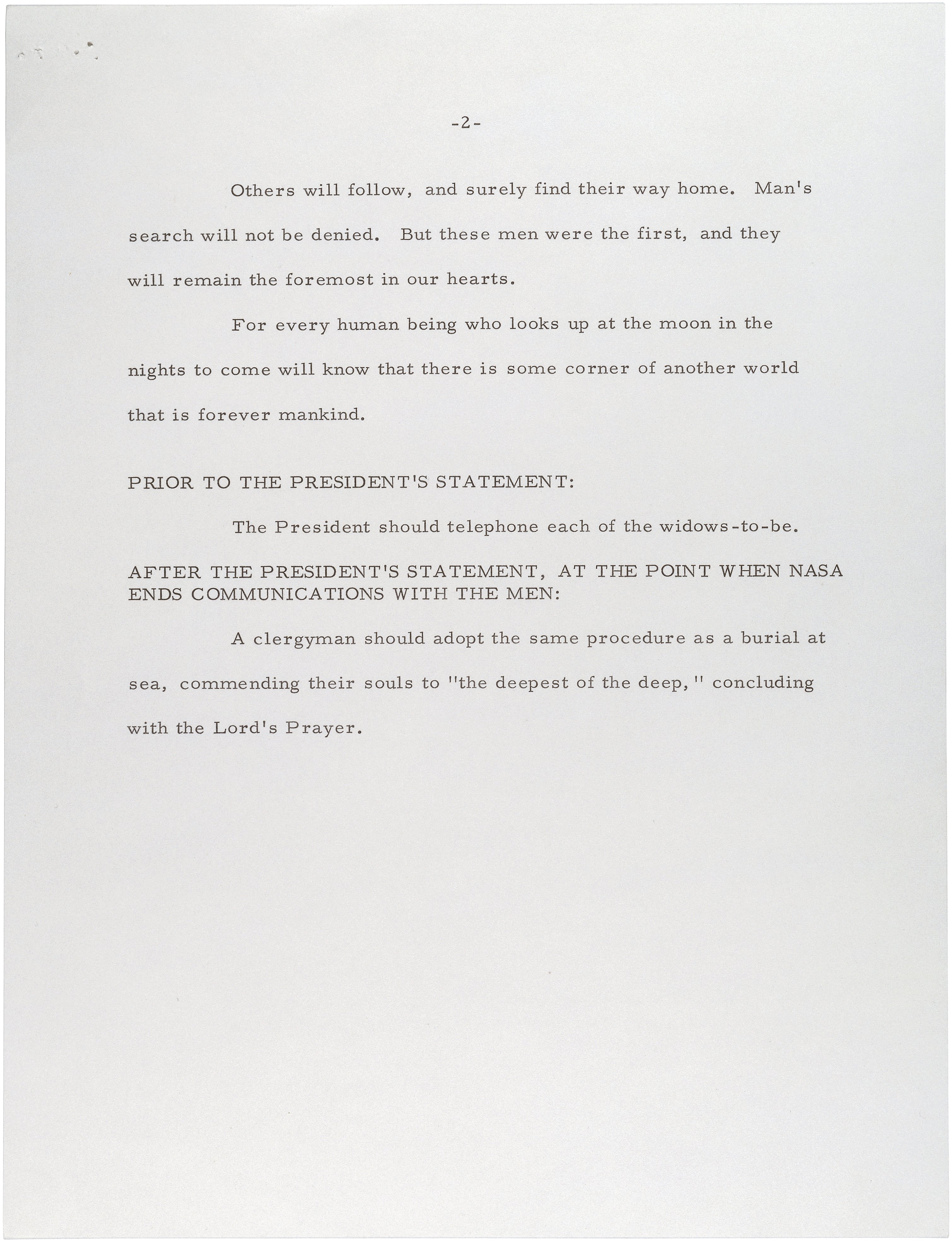 Page Two. Statement for President Nixon to read in case the astronauts were stranded on the Moon, July 18, 1969. Unbeknownst to the American people, one of the President's speechwriters, William Safire, was asked to write a statement that the President would make to the American people in the event of a disaster. Though never delivered, it remains an eloquent tribute to the bravery and pioneering spirit of the astronauts. When the astronauts of Apollo XI returned safely to earth, their mission was hailed around the world as an achievement of epic proportions, and this statement was quietly tucked away into the record. National Archives and Records Administration, Nixon Presidential Materials Staff. This document is also scheduled to be on display in New York, San Antonio, Los Angeles, and Hartford.