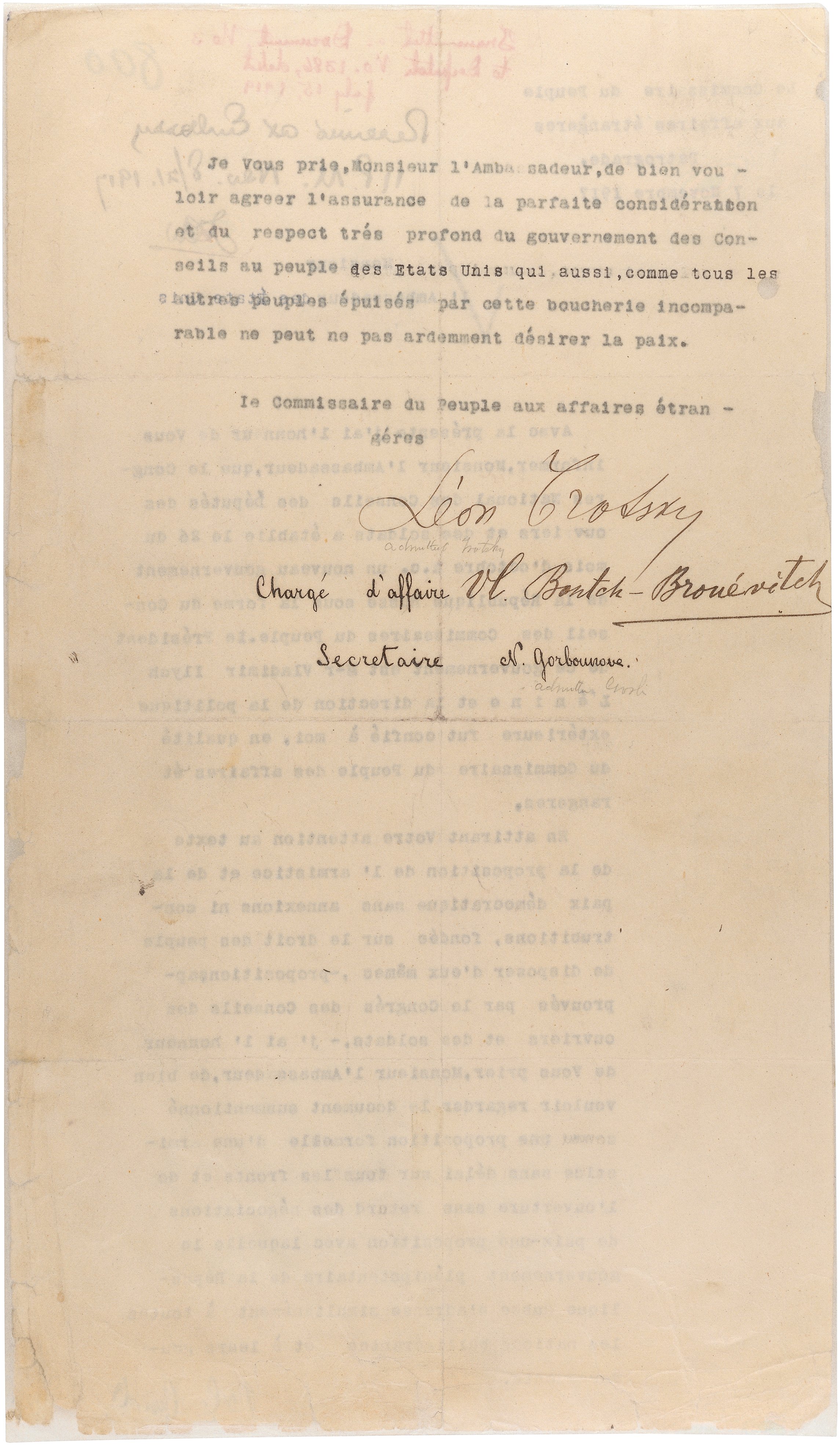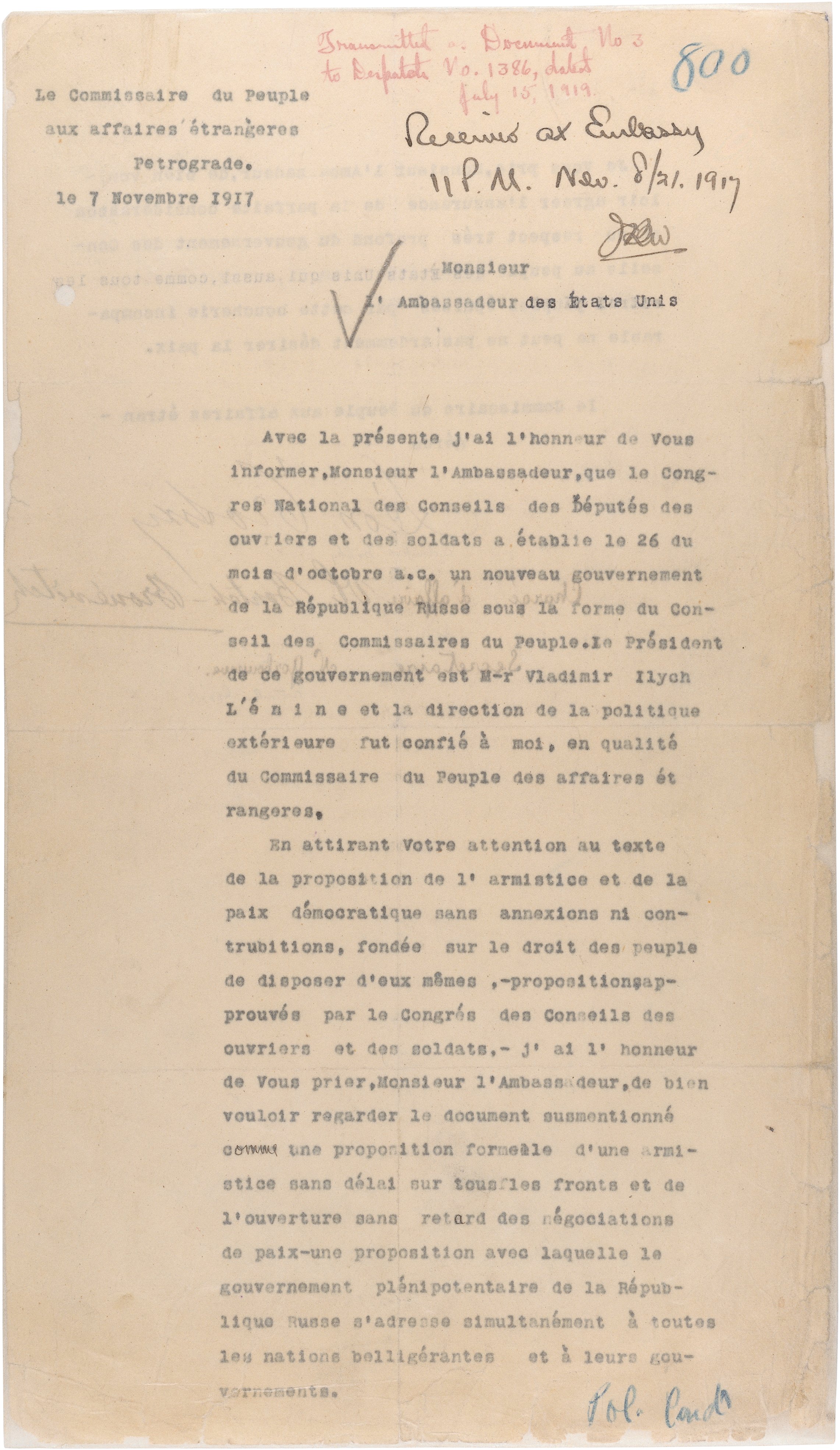 • *Letter from Leon Trotsky, Commissar of Foreign Affairs to U.S. Ambassador David Francis, received at the Embassy on November 21, 1917. This letter is the first formal notification of the establishment of the Soviet regime.
