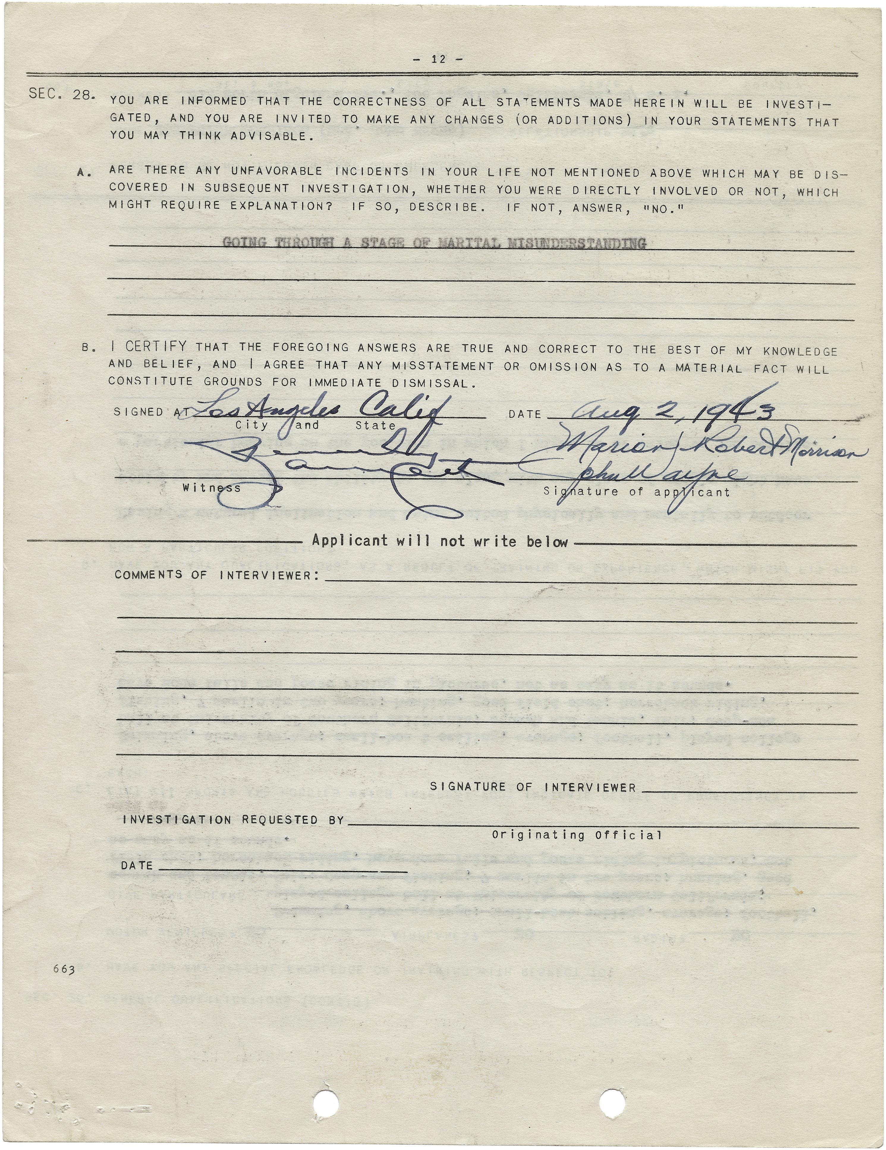 - Los Angeles: John Wayne's application for a commission with the Office of Strategic Services (OSS), 1943.