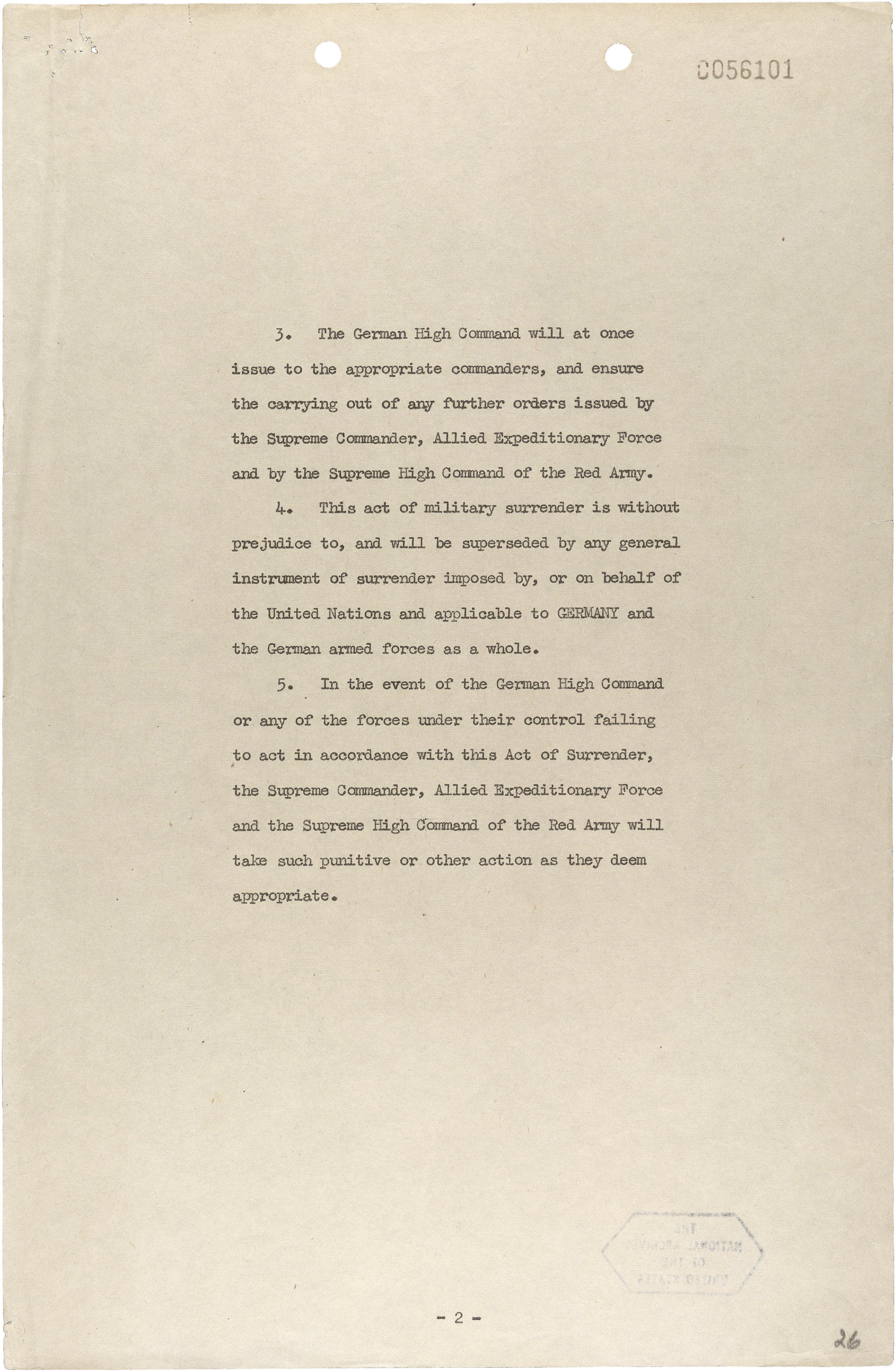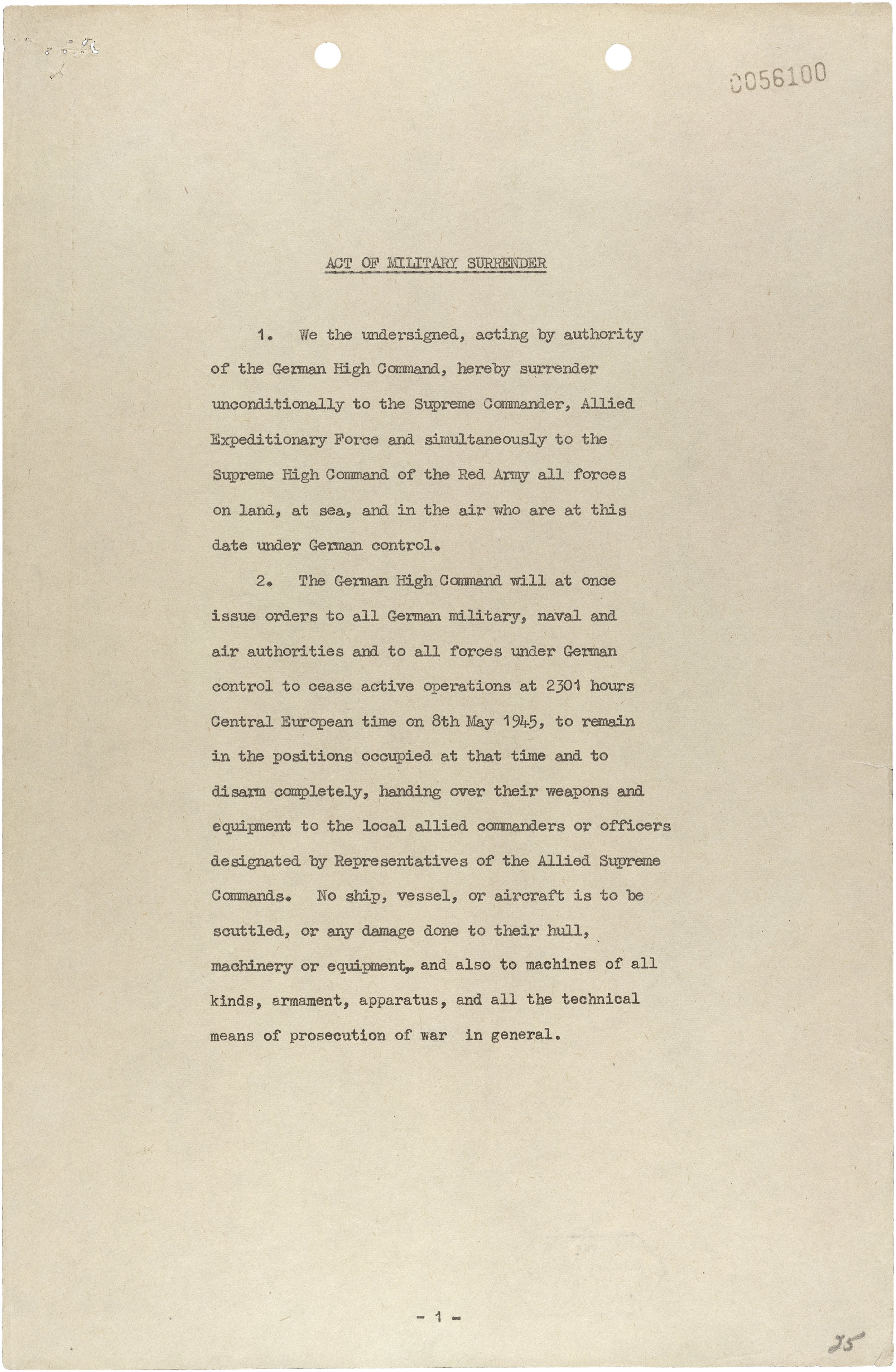 - German Military Surrender, signed at the end of World War II, May 1945.