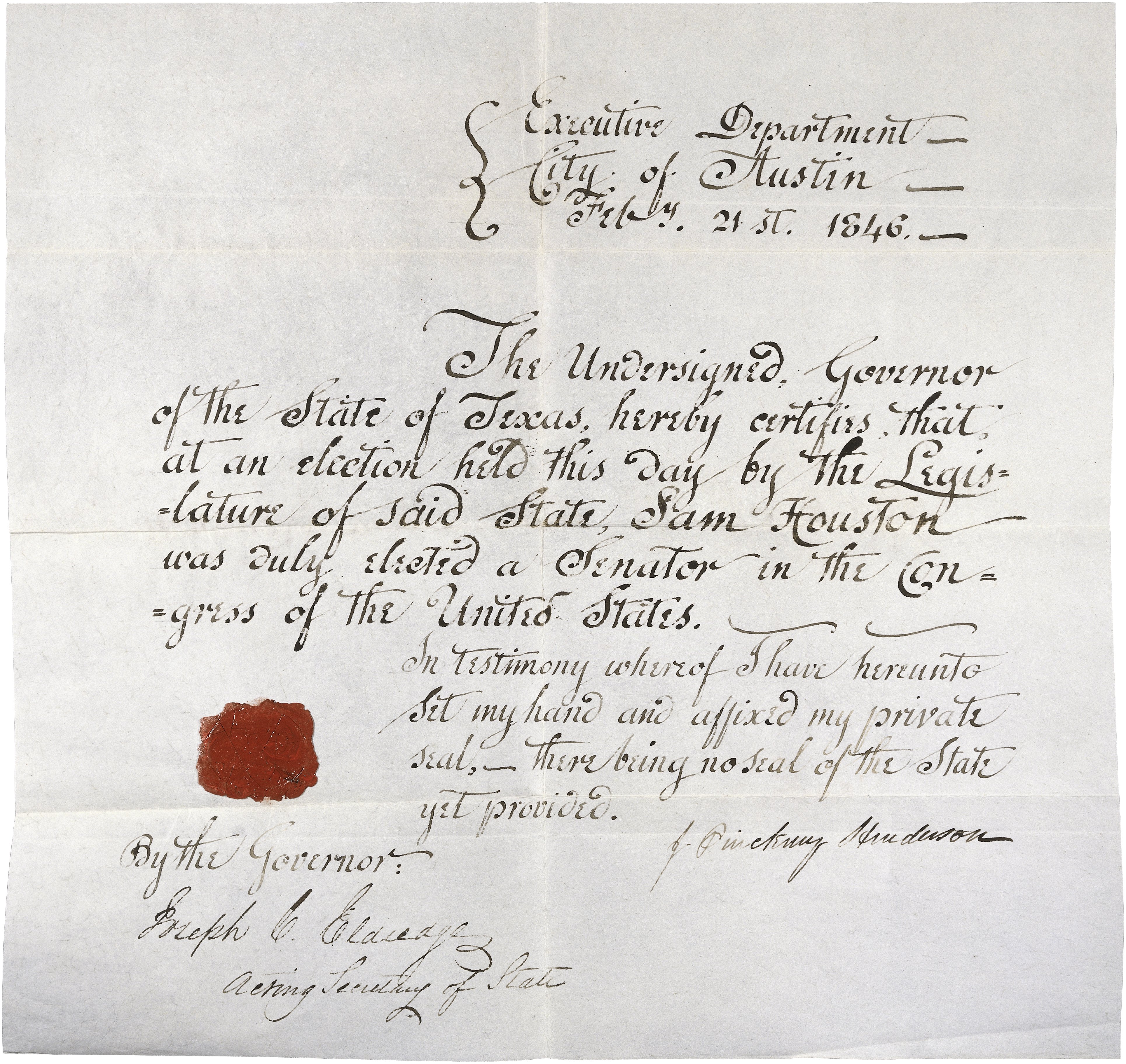- San Antonio: Credentials of the Honorable Sam Houston, Senator from Texas, February 21, 1846.