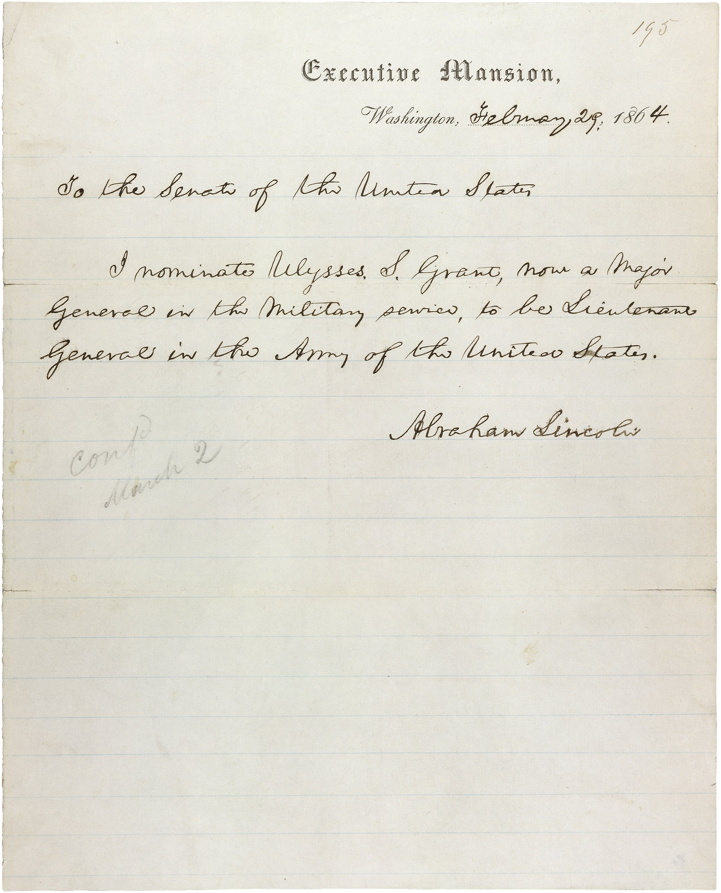 - Columbus: President Abraham Lincoln's nomination of Ulysses S. Grant, a native son of Ohio, to be Lieutenant General of the U.S. Army, February 29, 1864.