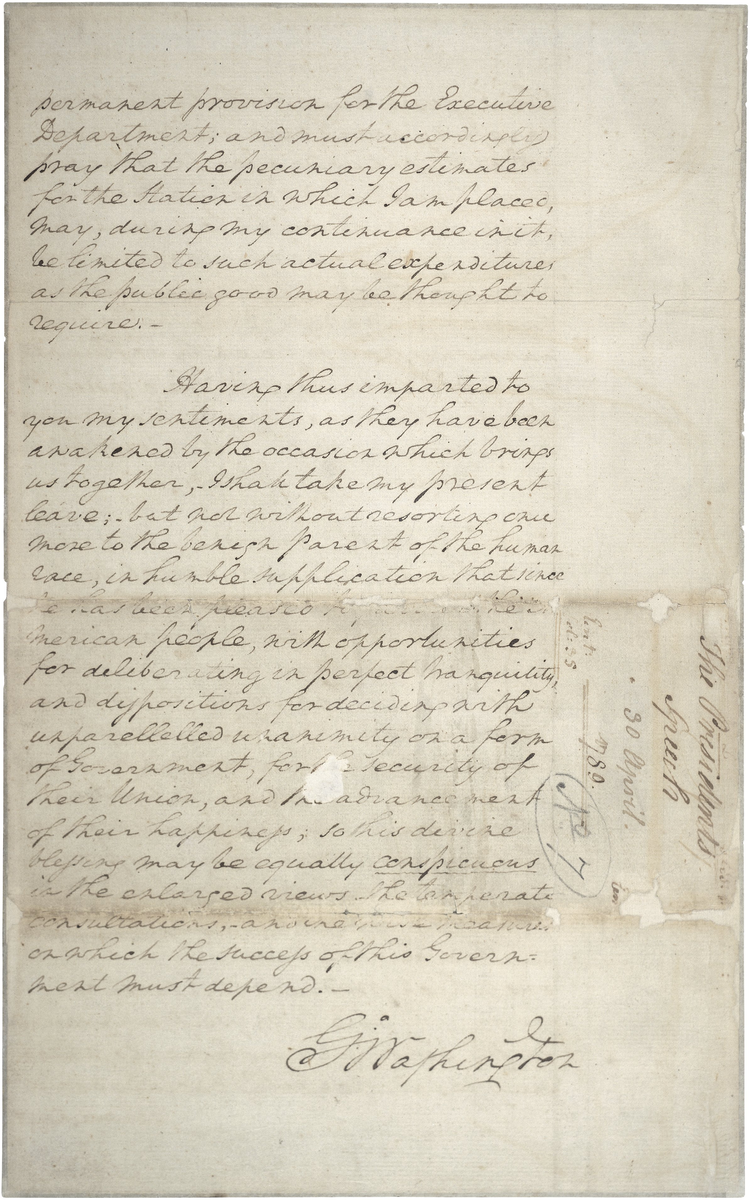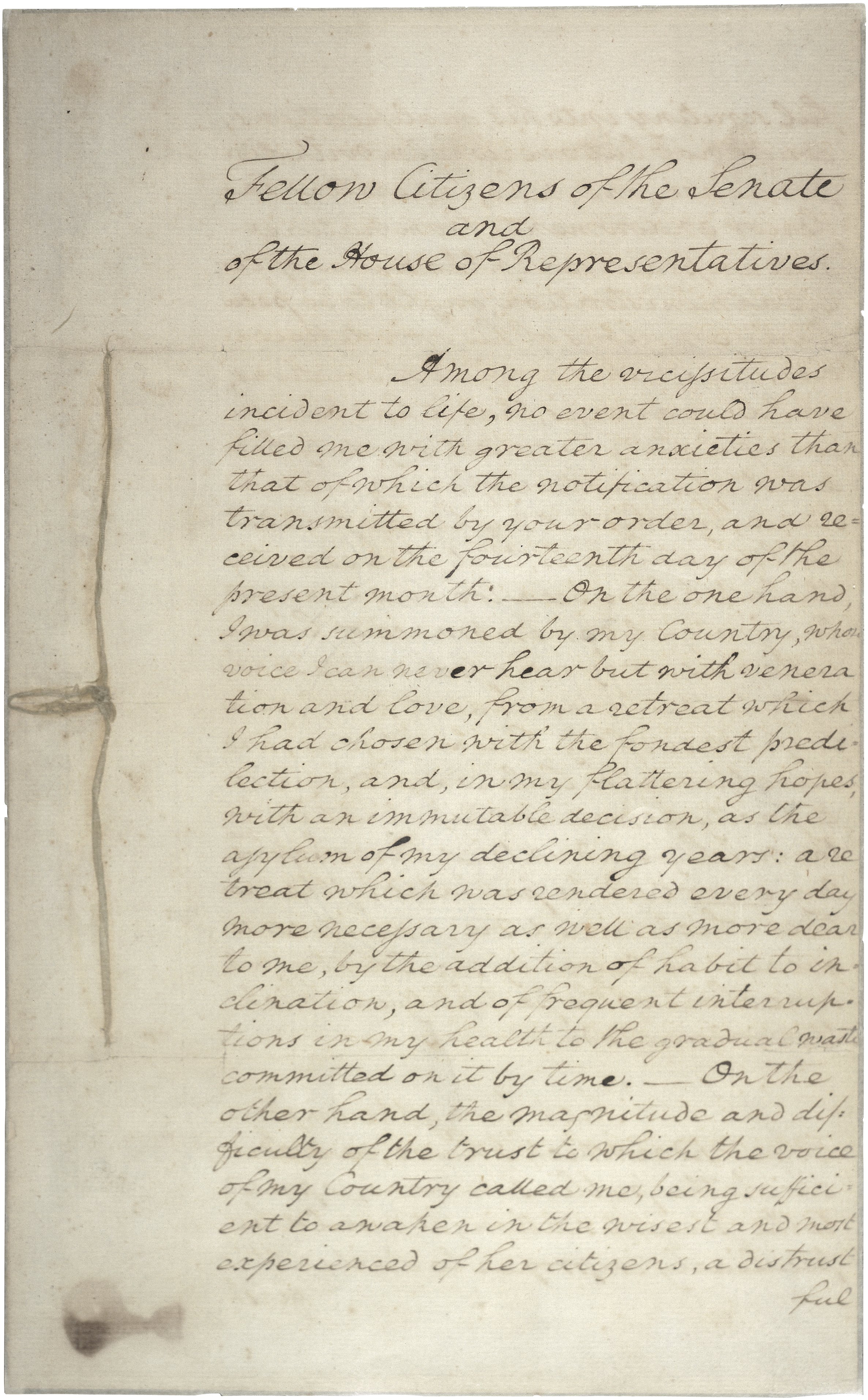 - New York: George Washington's first inaugural address, delivered in New York City, April 30, 1789.