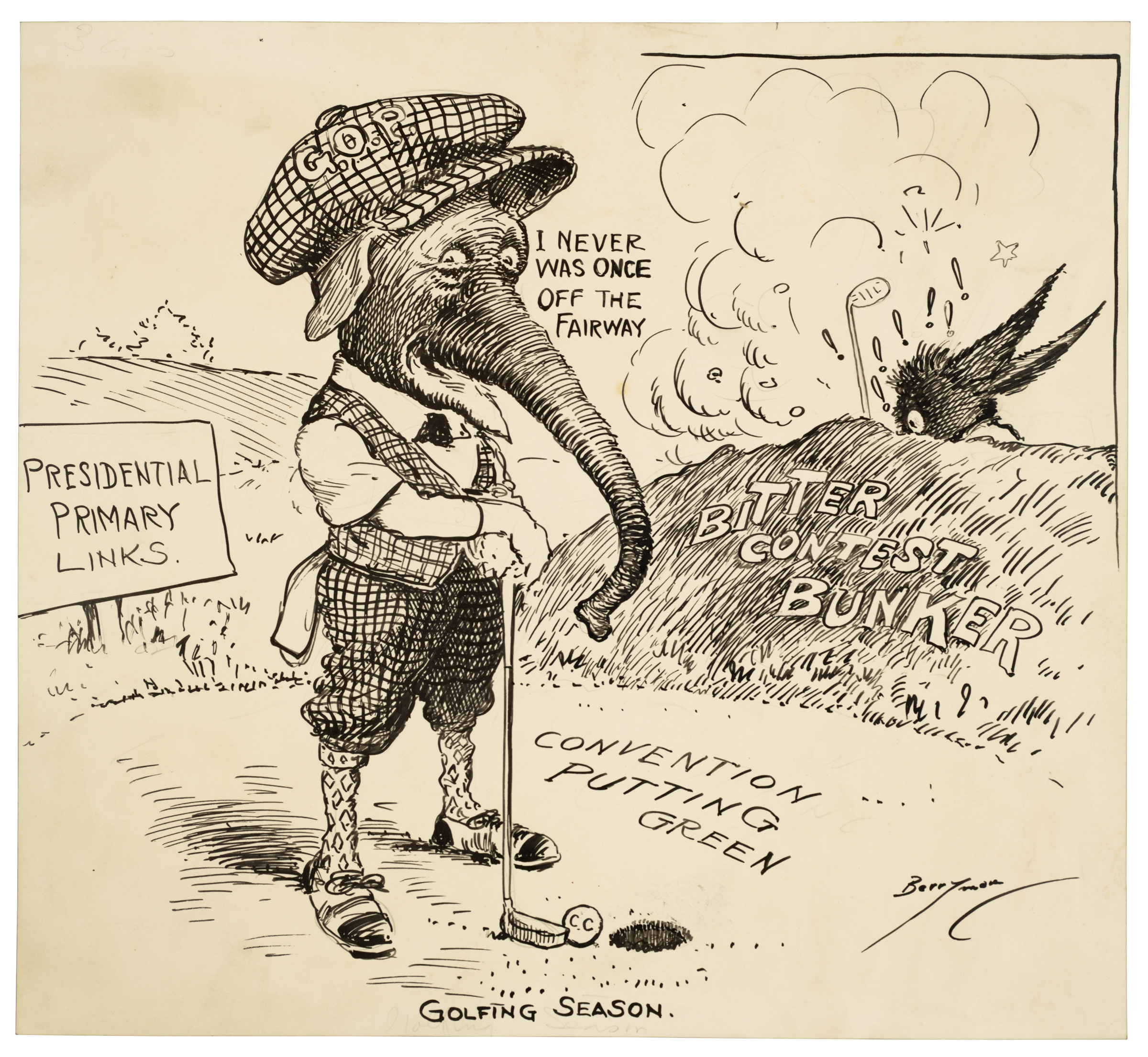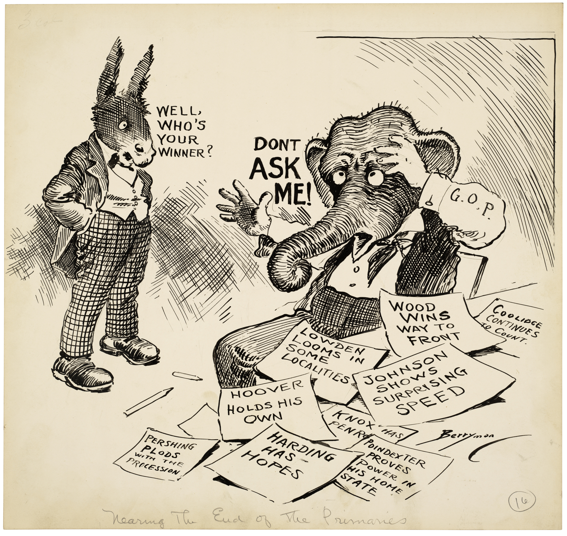 After potential candidates declare their interest in running for office, each political party determines who receives the party’s nomination. Although he drew the cartoons nearly a century ago, Berryman’s insights on the nomination process are still relevant today.