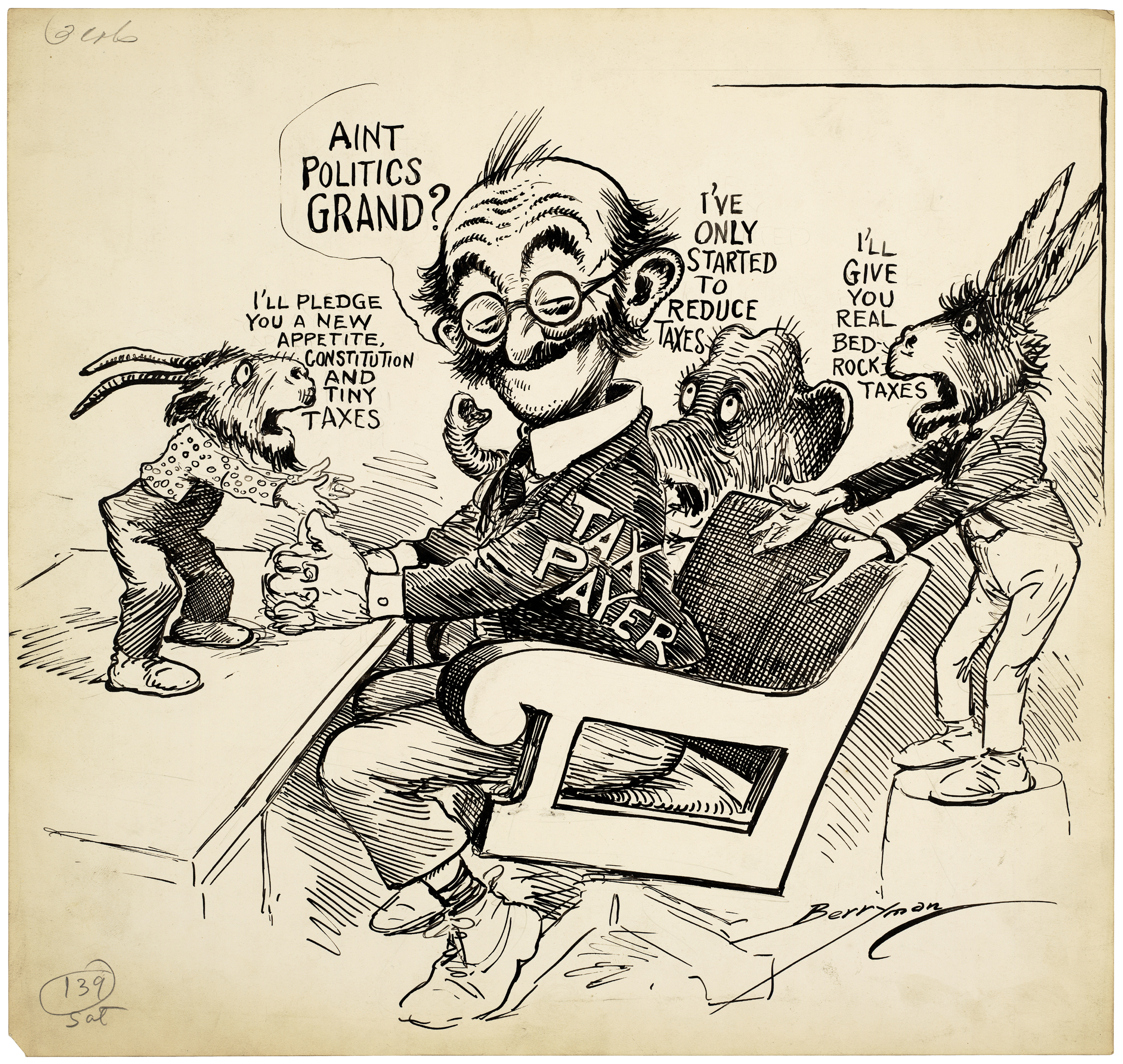 Elections revolve around voters. Candidates woo them; campaign issues are tailored to them; parties mobilize them; and democratic governments serve them. In these cartoons, Berryman captures the mood of the voters as various elections draw near.