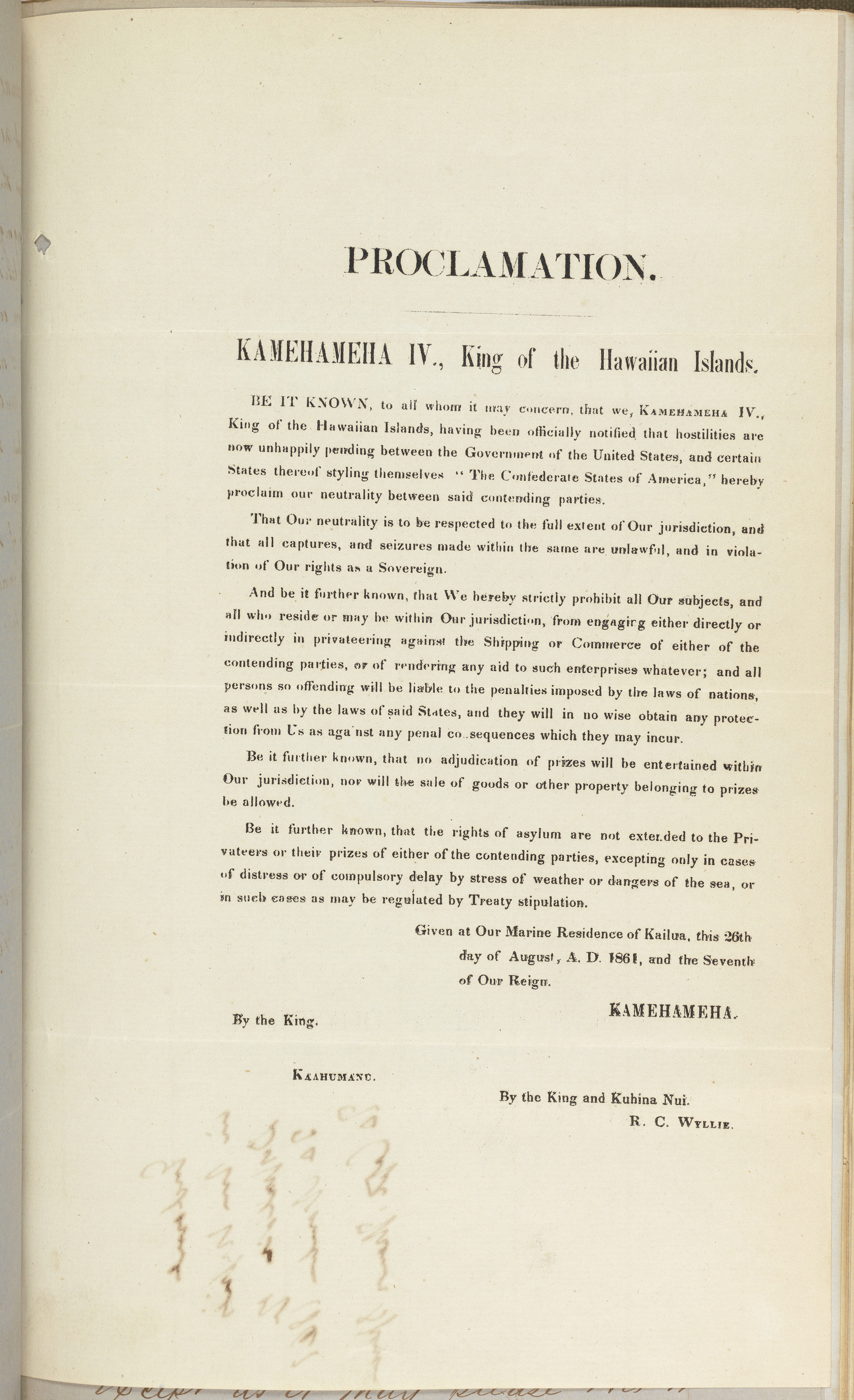 In August 1861 King Kamehameha IV proclaimed that the Hawaiian Islands would remain neutral in the conflict between the United States and "certain States therof styling themselves The Confederate States of America." The King prohibited his subjects from helping either side raid commercial vessels. Since commercial raiding was a key component of the Confederacys naval strategy, that ultimatum affected the South more than it did the North. National Archives, General Records of the Department of State