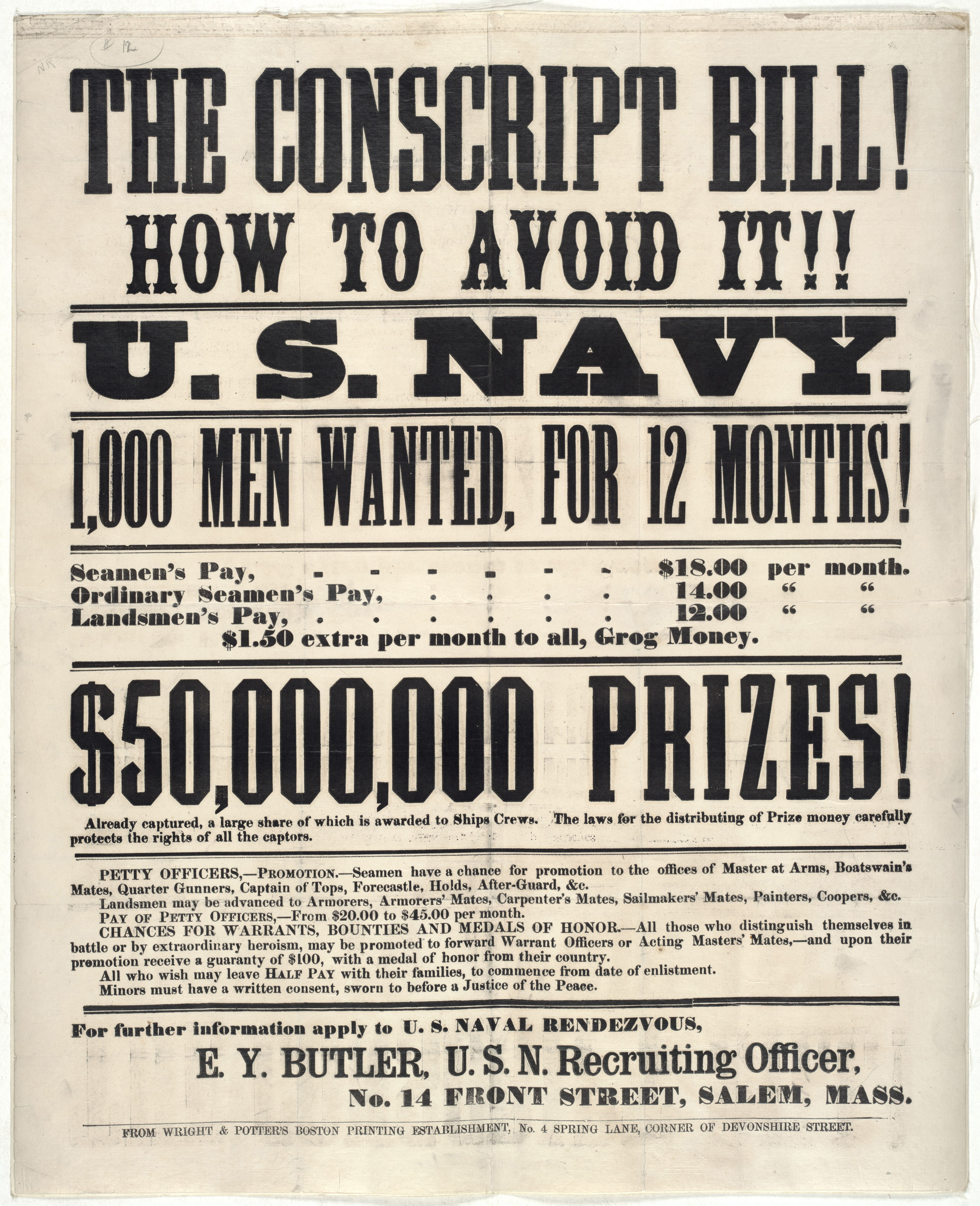 When the U.S. Congress instituted a draft in 1863, many men sought to avoid Army service. The US Navy, which relied on volunteers for manpower, used this broadside to convince possible recruits that service in the Navy could be much more financially rewarding than Army pay. National Archives, Naval Records Collection