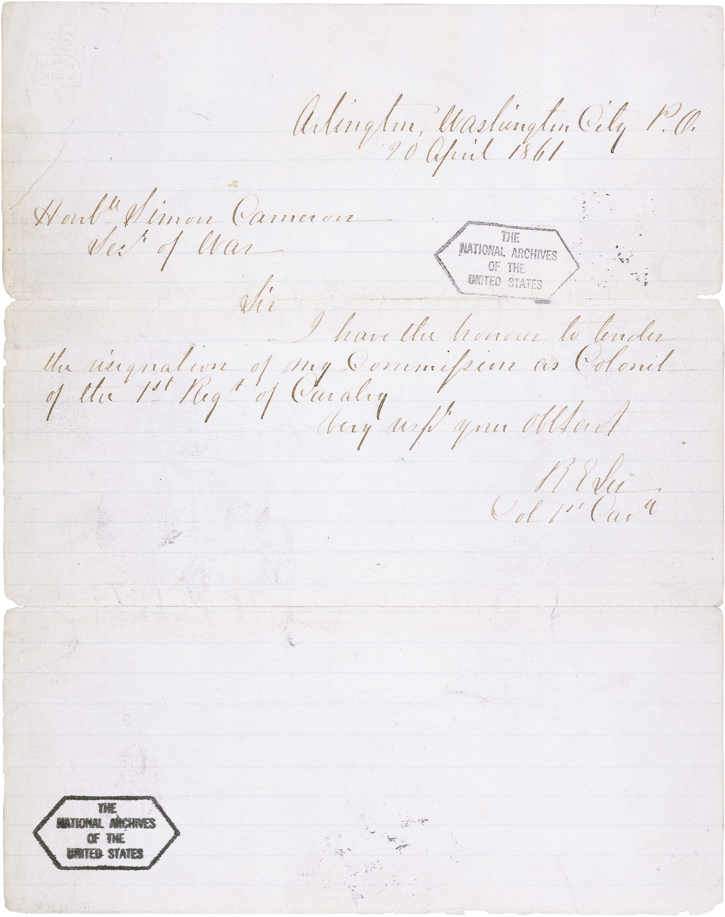 Hundreds of officers serving with the United States Army, Navy, and Marine Corps resigned their commissions as their states, or adopted states, seceded. These men wrote to the Secretary of War or Navy, their commanders, the Adjutant General, or the President to resign. Sometimes their resignations came after their acceptance of commissions in the Confederate States Army or the armies of their states.
